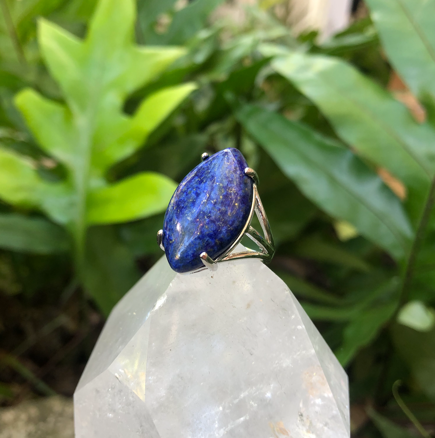Spiritual power & telepathy Platinum plated brass ring Adjustable Properties:inner vision, stone of truth, royal virtues Chakras: third eye (6th), throat (5th) Spiritual properties:enhances telepathy, visionary awareness, past life recall, deepens meditation. Lapis lazuli was used widely by the pharaohs of Egypt for its' powerful ability to bring about insight and spiritual transformation. It's known as a stone of royalty and spirituality. Carrying with it the vibration of the inner king or queen that lies within us. It's also a stone of visionary awareness, helping to bring awareness to the soul, and by activating the third eye it can aid in enhancing intuition.
