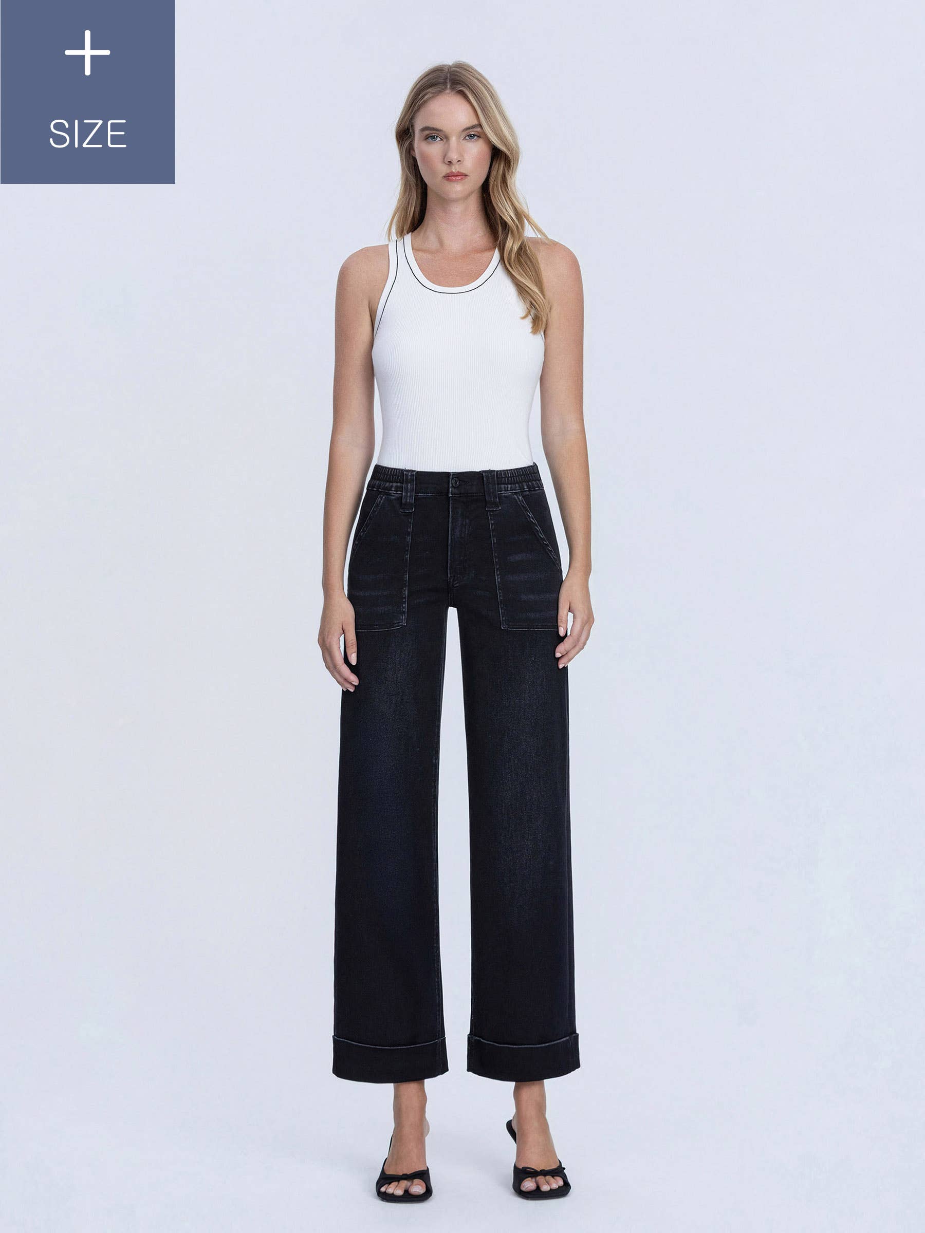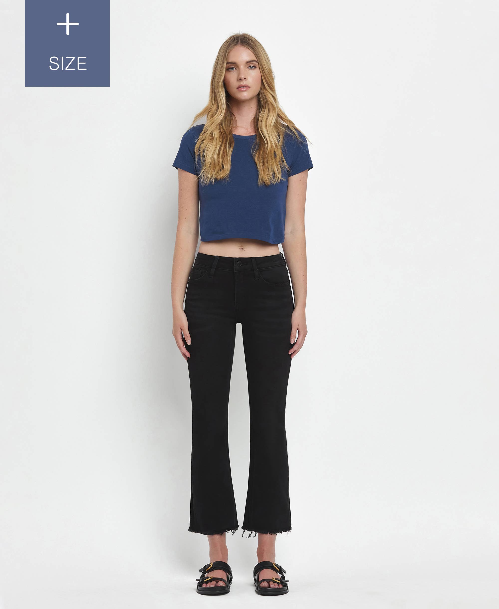 MID RISE RAW DISTRESSED HEM CROP FLARE JEANS COMFORT STRETCH DENIM, MID RISE WAIST, RAW DISTRESSED HEM, CROPPED LENGTH, FLARE JEANS F. RISE: 9" / INSEAM: 27" / LEG OPENING: 16 1/2" MODEL IS 5'10" WEARING A SIZE 26