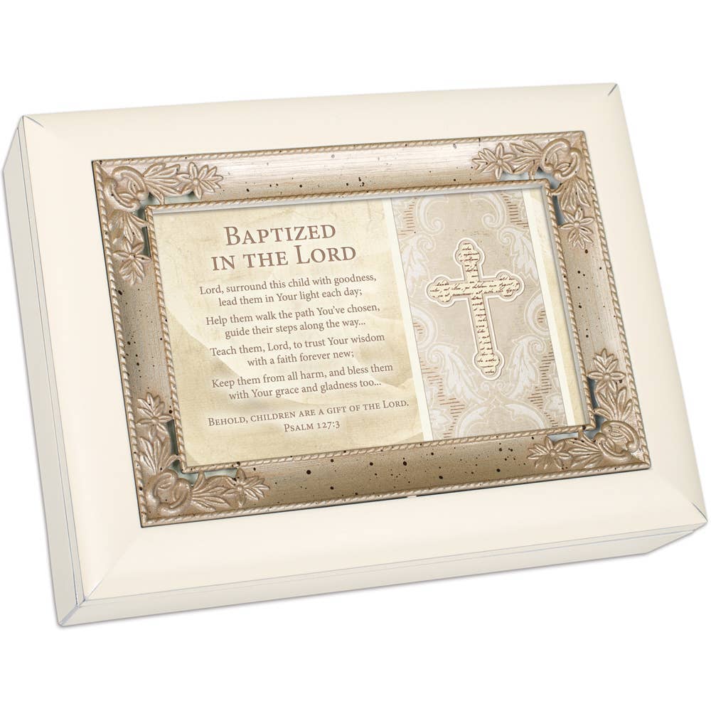 Italian inspired design with a rich burlwood finish and silver color inlay photo frame lid.Music box measures approximately 8 x 6 x 2.5 inches; Replace artwork with a 4 x 6 inch personal photo. Black velvet lined interior and bun feet are padded to protect table top and shelf surfaces. Individually boxed. Traditional wind-up mechanism plays: How great thou art..