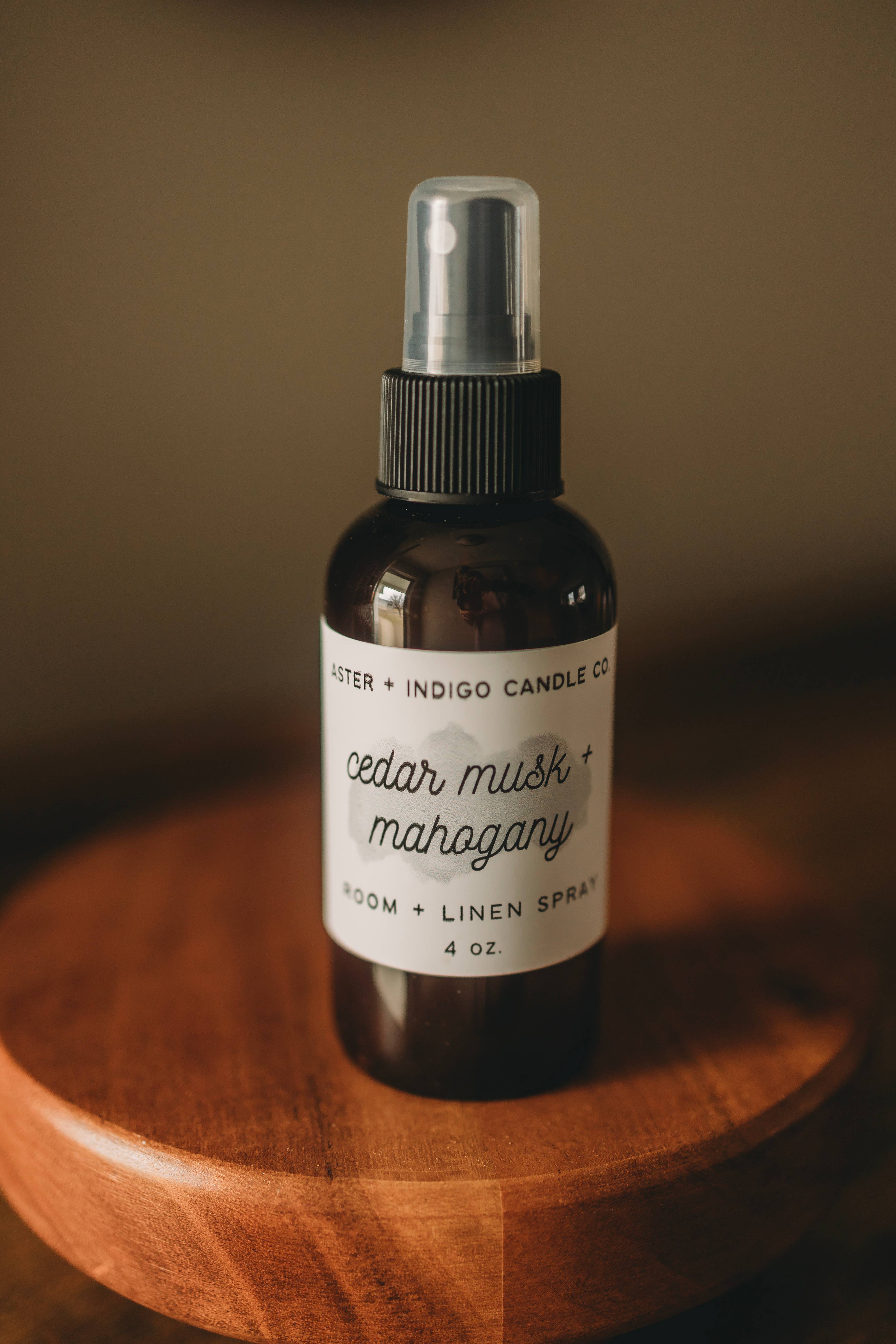 Notes of sherry, whiskey and woods create a cozy and richly alluring scent that is a customer favorite! | Our 4oz room + linen spray offer a simple solution to the home fragrance experience. | A few spritz of our minimal ingredient room spray will fill a room with scent that lingers for hours. | Ingredients include distilled water, vegetable based polysorbate, a natural preservative and a small amount of skin safe, phthalate free and Prop 65 compliant fragrance oil. *1oz store tester available for purchase*