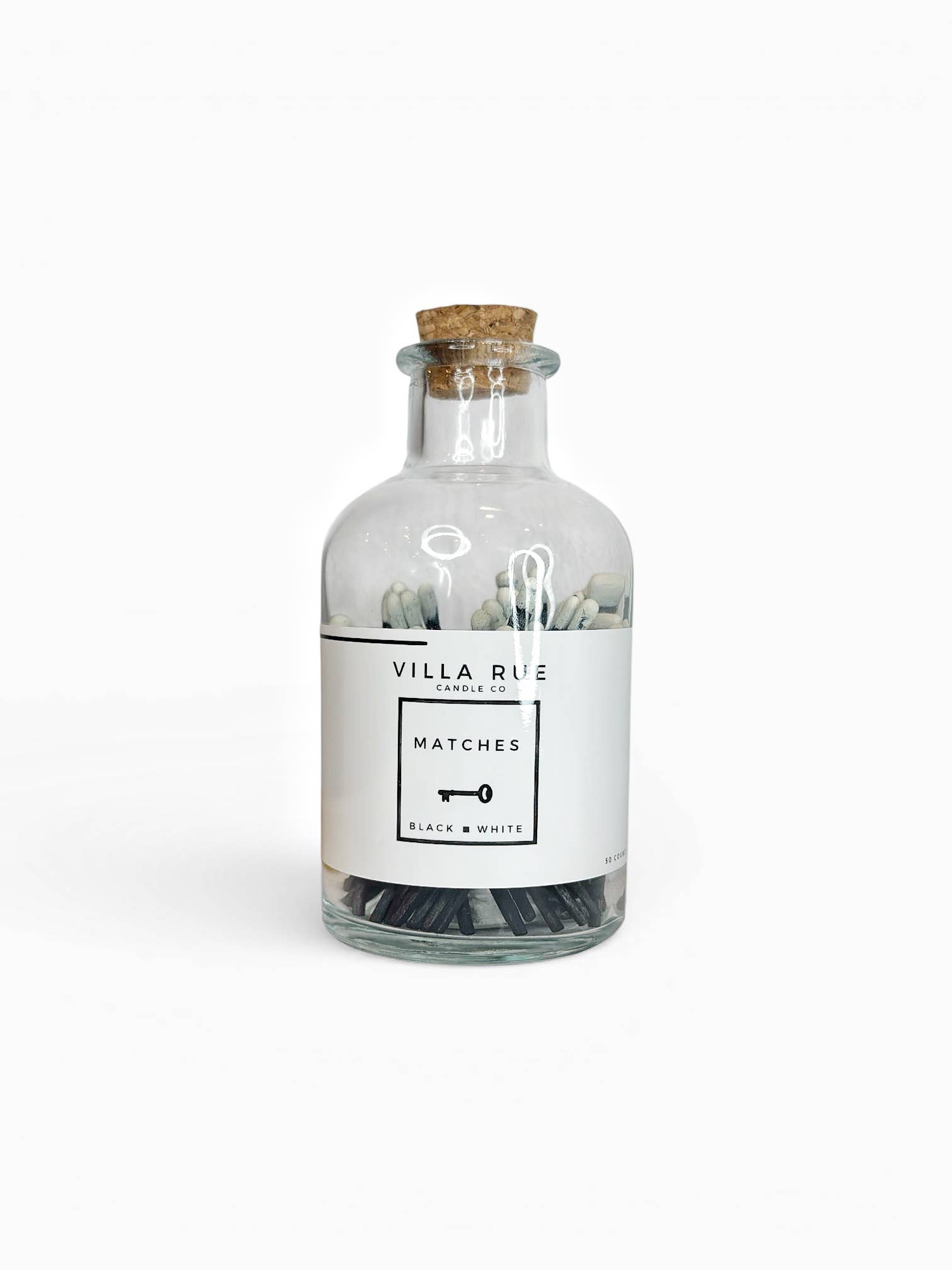 Colored tip matches in an apothecary-inspired glass bottle with a cork top and a striker on the bottom. Approximately 75 matches included. Colors: Red, White, and Blue Bottle Dimensions: 3" tall x 1.75" wide / 50ml Label: Gold Foil Stamped Matchsticks: Approx. 2.0" in length DISCLAIMER: Keep product away from children. Never leave flame unattended. Throw away match after flame is extinguished and cool to the touch.