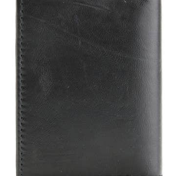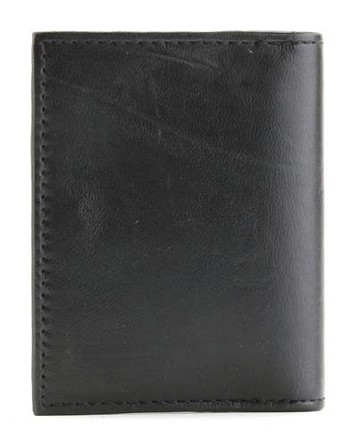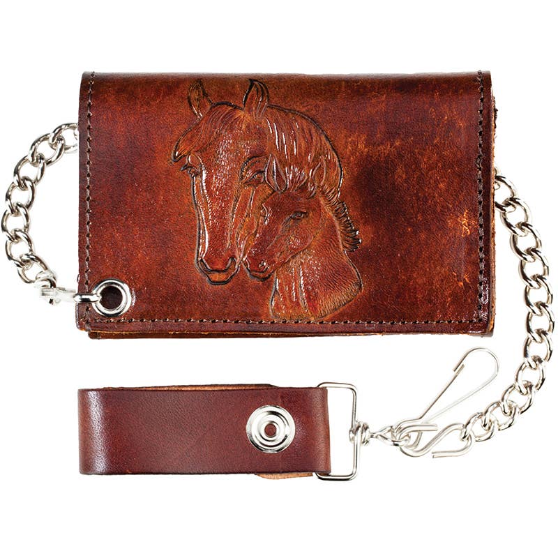 Black trifold chain wallet crafted from genuine leather. This wallet has double snaps securing the flap, two pockets, a card slot, a plastic photo insert, a detachable chain with a leather belt loop attachment, and a metal clip for extra security. Made in the USA. Features: - Material: Genuine leather - Measures 4" x 3" - 12" detachable chain - Handcrafted - USA Made