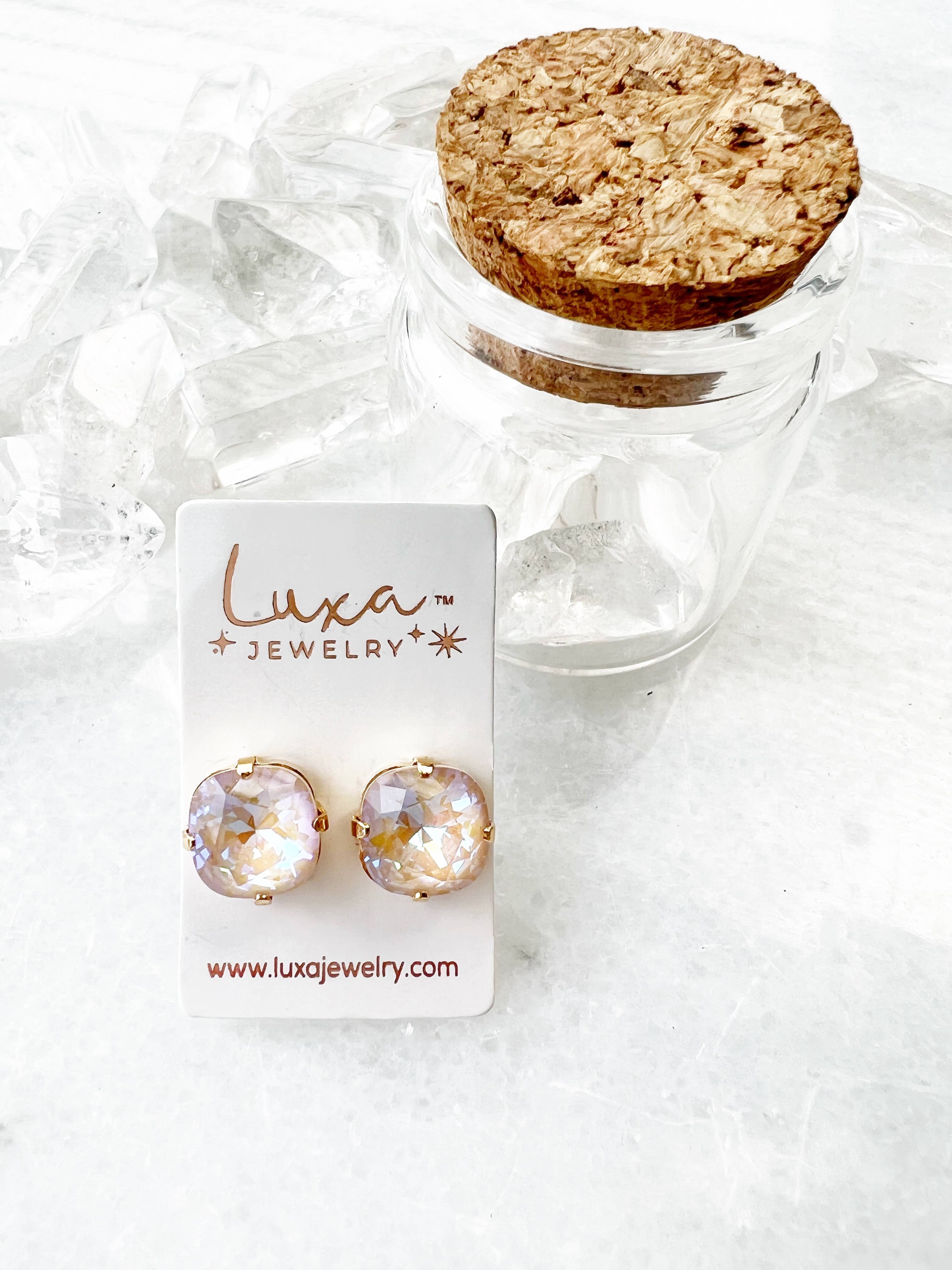 Luxa Color Pops feature beautiful multi faceted crystals. A great way to add a pop of color to any outfit! Packaging Each pair comes in this adorable little glass jar. Our products are packaged and delivered with care. Check out our FAQs for questions on shipping, processing, and more. Buy with confidence knowing we use top quality crystals Product Details Safe for sensitive ears Available in 2 metals: sterling silver plated and 18k gold plated Does NOT contain Lead or Nickel, known to affect ears Handmade north of Boston, MA
