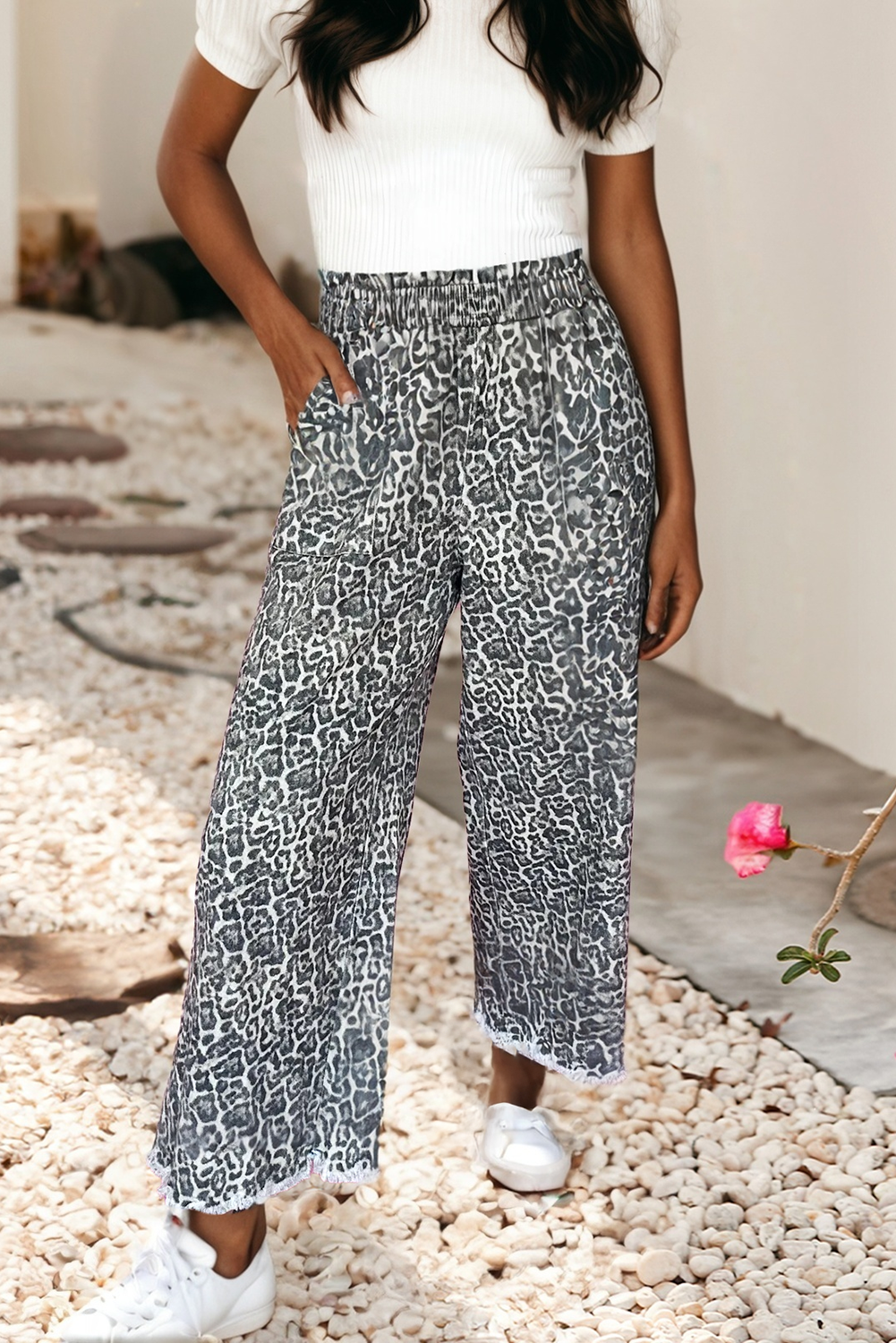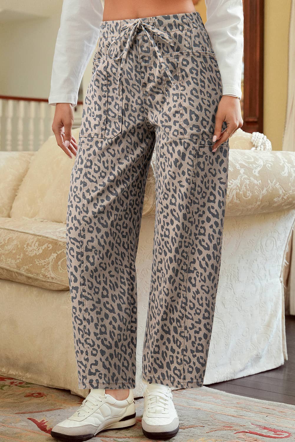 These straight leg pants have a high waist fit, pockets, and a wavy print all over. DETAILS Model is wearing a Small Height 5'7" Waist 23" Bust 32"