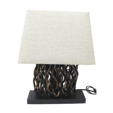Natural Vine Console Lamp, come with a Coarse Linen Shade wooden black base 43.5" wide and 8" deep linen shade 45.5" wide, 12" tall and 10" deep Completely assembled 26.5" tall Two light socket 60 watts max Scandinavian designed and made in Thailand