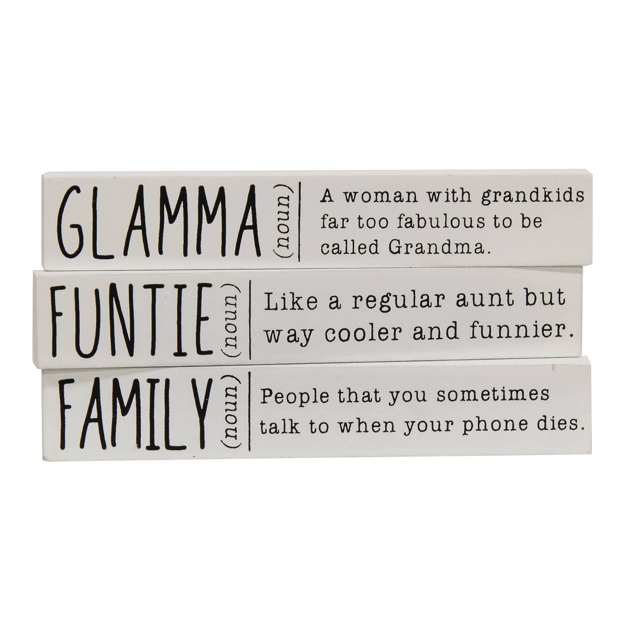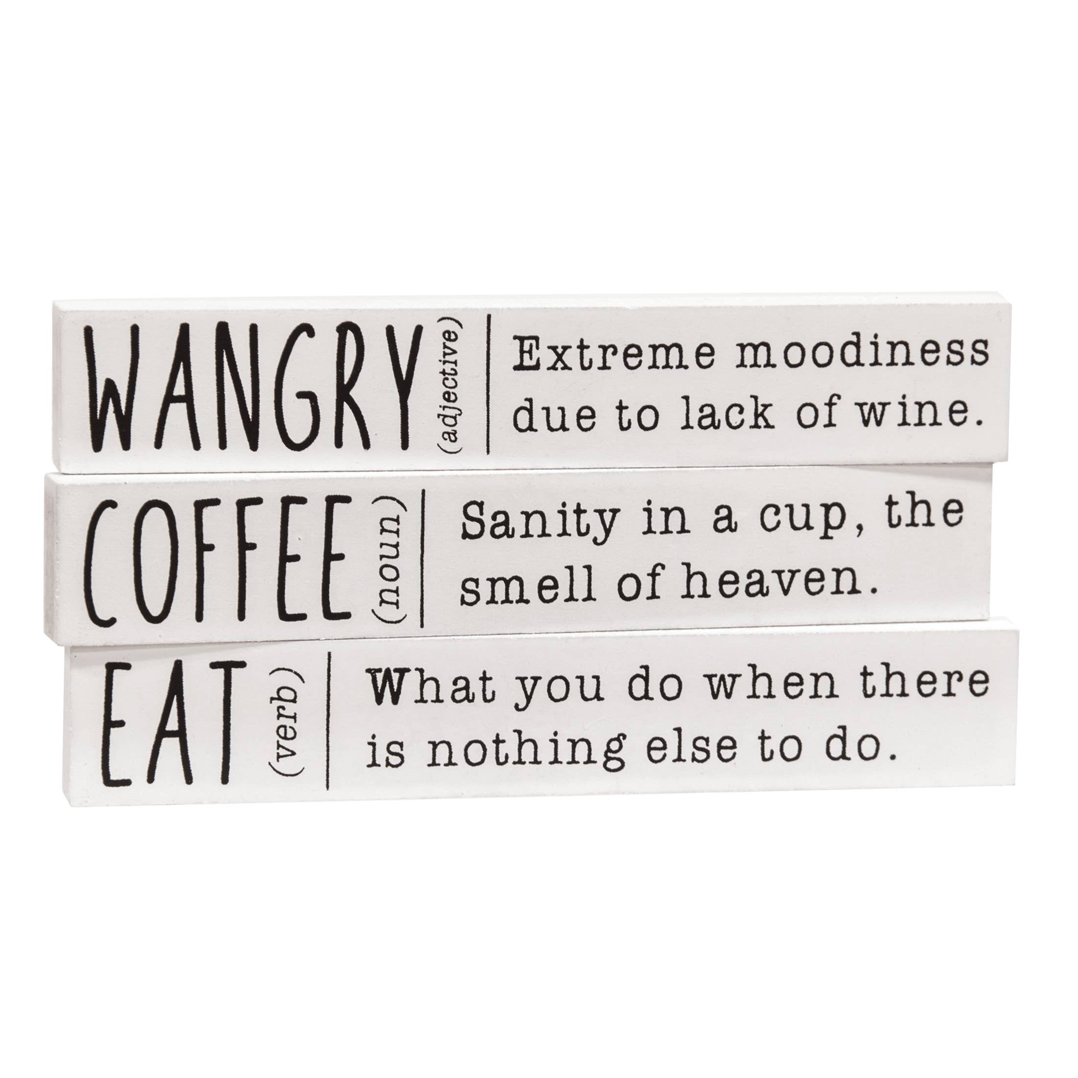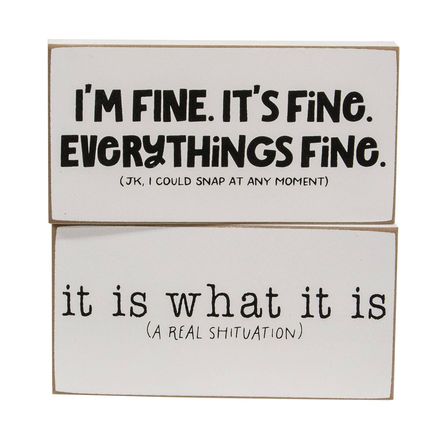 This mini stick assortment features 3 humorous sayings: "I'm fine... The rest of you need therapy," "Some things are better left alone, like me for instance," or "Life of the party (As long as it ends by 9 PM)" Each measures 1" high by 6" long by 0.5" thick and has distressed edges. Please note: This item features a variety of designs which are priced individually, not as a set. When you order a quantity of 18, you will receive 6 of each design. Designs are not interchangeable.