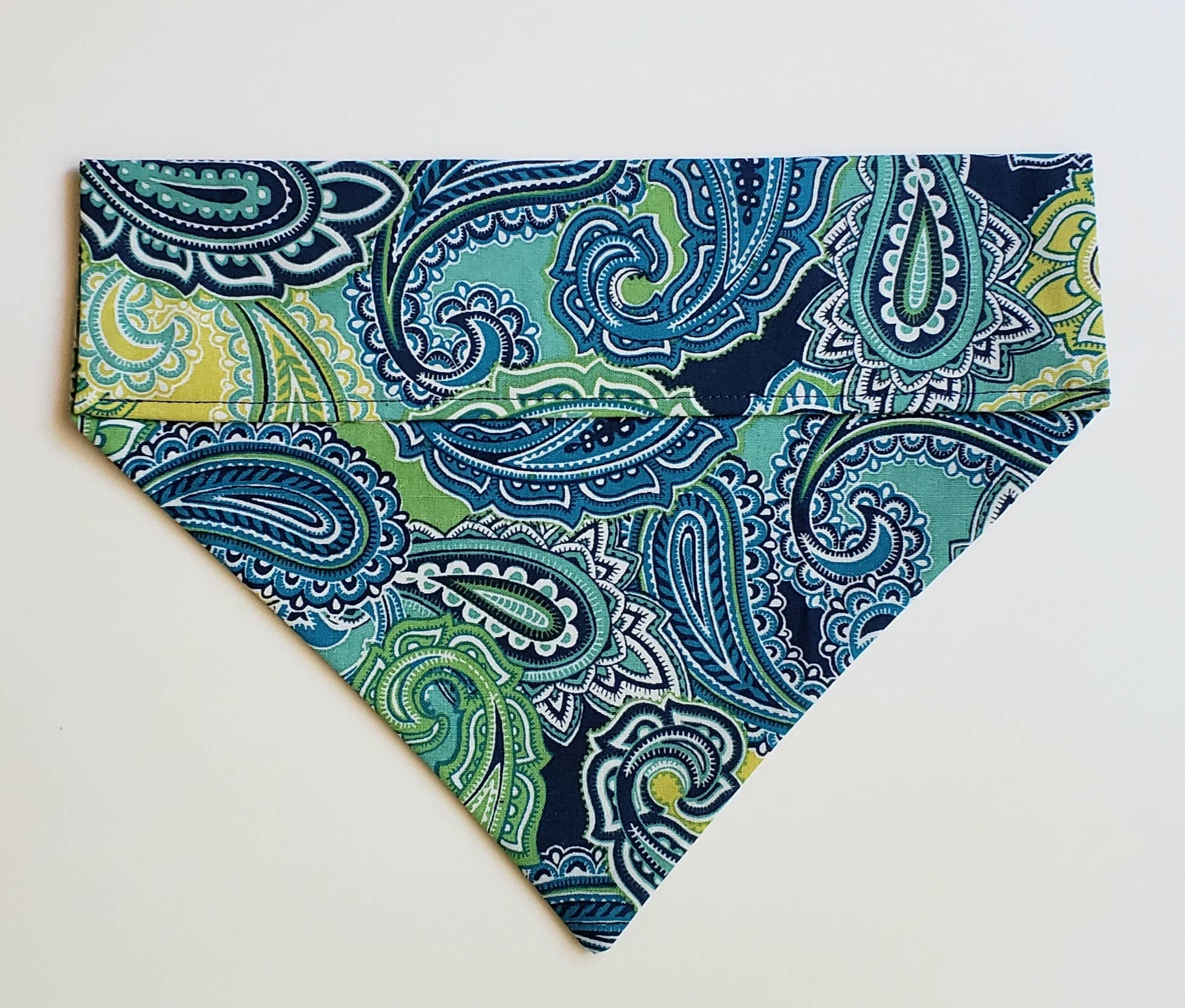 Classic meets canine charm in our blue paisley bandana! With cool shades of blue and adorable paw prints and dog silhouettes woven into a timeless paisley pattern, it's a fresh twist on a beloved look. These high quality dog bandanas are super-cute, super-fun and super-affordable! They are 100% Made in USA and 100% Cotton Fabric. Awesome for your own dog(s) but also make fabulous, unique gift ideas for lucky dog owners in your pack of friends. Available in 2 sizes! No special clasps - just tie one on. It's that simple! Wash delicate cycle with like items or hand wash with cold water.  Lightly steam with iron on non-printed portions of bandana to freshen if necessary.