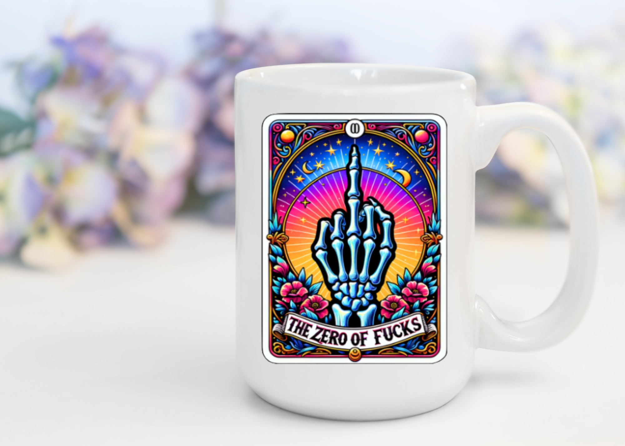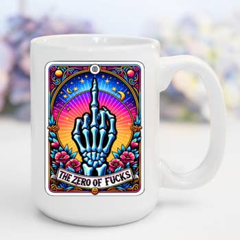 SKU: M0667_11ozTarotZeroFucks Made in China Care Instructions: Dishwasher Safe and Microwave Safe Color: Multi-Colored Material: Ceramic Occasion Theme: Everyday and Halloween Season: Year-Round Style: Bohemian Theme: Gothic Tone: Funny Product Language: English Weight: 453.59 g (1 lb)