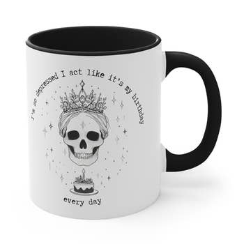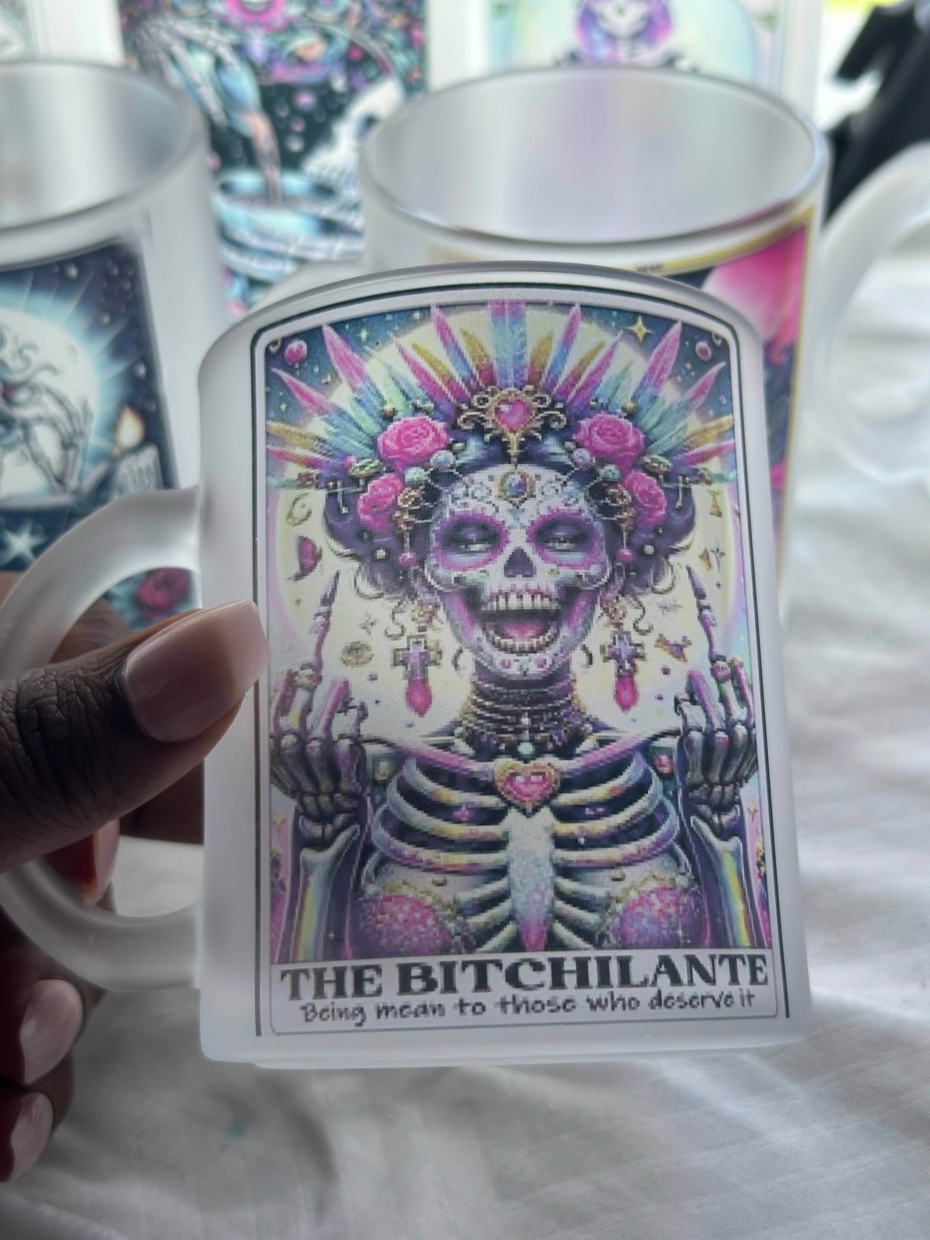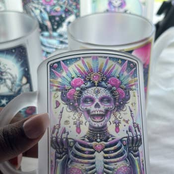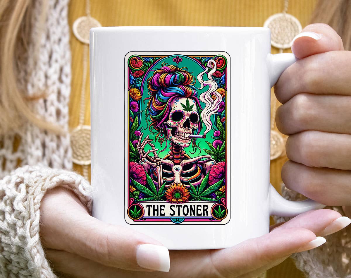 Sip with sass and a side of mysticism. The Zero F’s Given Skeleton Tarot Card Mug blends gothic aesthetics with dark humor, featuring a chill skeleton mid-repose, surrounded by celestial symbols and a “zero f’s given” tarot card design. ABOUT THE MUG -11oz or 15oz ceramic mug -Dishwasher and microwave safe -Design printed on both sides of mug -Heat sublimated for a long lasting vibrant design -Printed and designed in the USA -Blank mug sourced from China Gift shops • Bookstores • Witchy boutiques • Tarot readers • Occult pop-ups • Halloween displays • Snarky holiday bundles