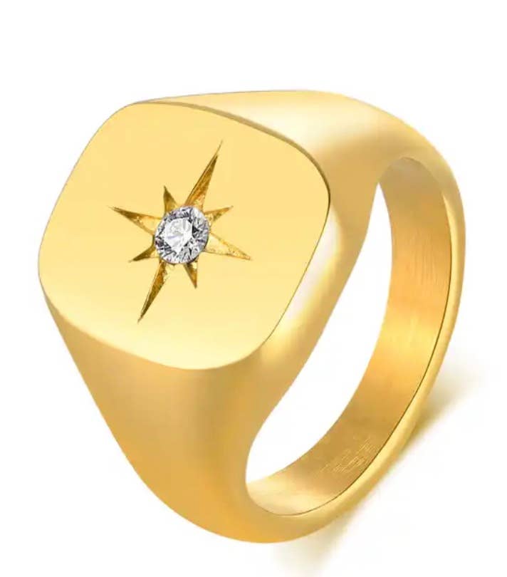 This is a special piece it is our take on a vintage Dome Ring with gemstones. Done is a confetti pattern and engraved with the Celestial stars. Evil Eye. Stacking Ring This Dome is Very high quality. It is Steel making it Waterproof, Hypoallergenic and very strong. It is Genuine 14K gold plated and coated this is called 20 Year plating as the Microns are very high. Will withstand regular use and hand washing and should last a very long time.