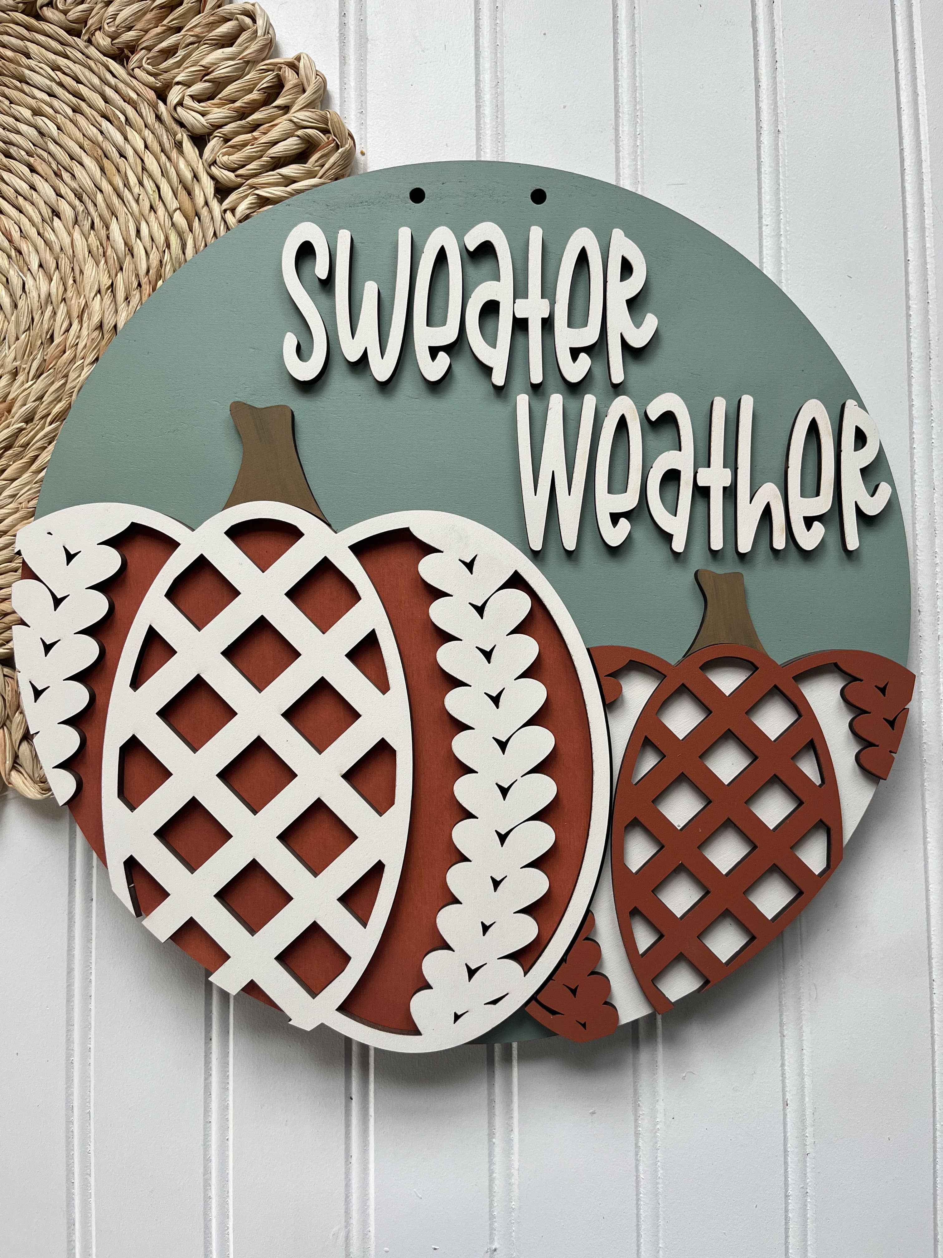 Circle topped with a hello pumpkin / chevron/sweater inspired design. Ready for you to paint an assemble.