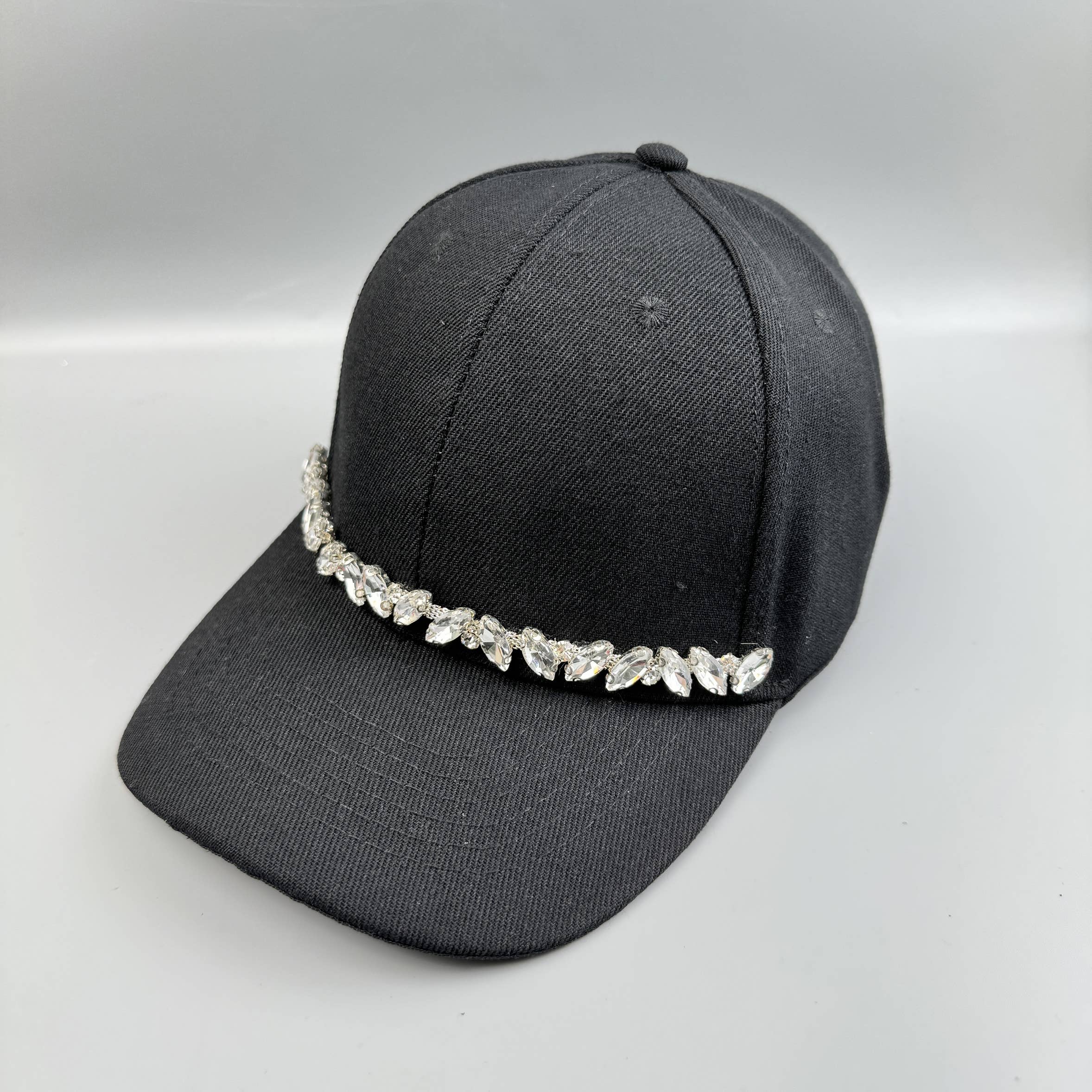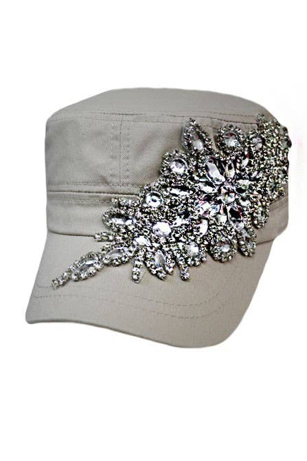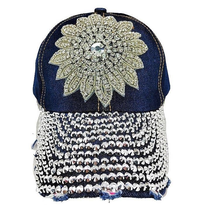 Sunflower Bejeweled Glitz Cadet Cap. Features hand-stitched sunflower detailing with Silver/AB stones for a touch of sparkle, and an adjustable Velcro closure.