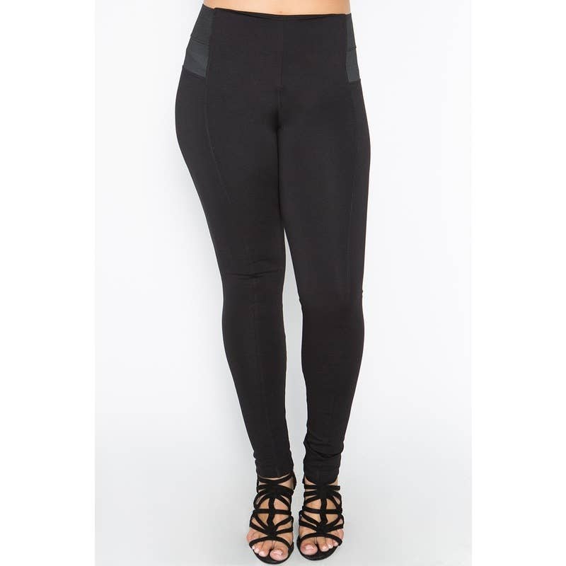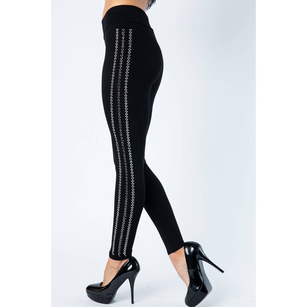 Bling Leggings • Size : One Size • Size : Plus Size • Material : 60% Polyester, 30% Cotton, 10% Spandex Stretchy and stylish, these Bling Leggings feature rhinestone side stripes that add eye-catching sparkle—perfect for athleisure or a night out.
