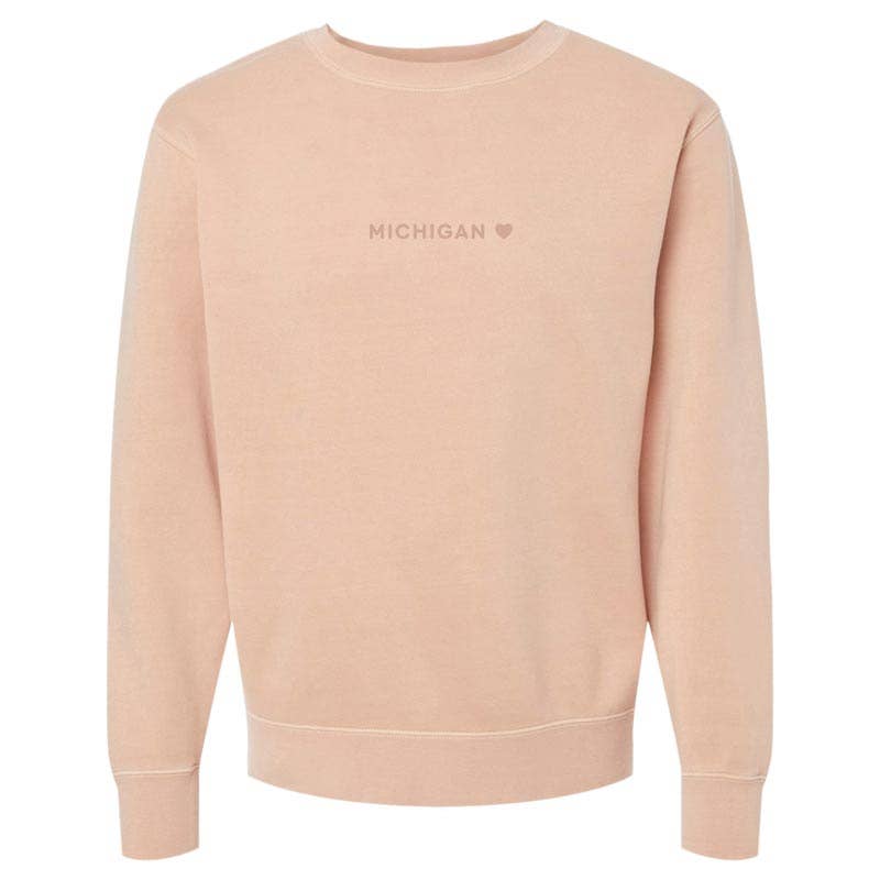 Tone-on-tone embroidery makes for a subtle, trendy way to display your Michigander status! Choose from the many colors available. Female model in videos wears size XS, Male model in videos wears size L. Sizing * Unisex relaxed fit - fits loose for a less structured, more relaxed silhouette. Details * 80% cotton/20% polyester blend * This is a pigment dyed product. Please note that the pigment-dyeing process gives each garment unique character. Please allow for slight color variation in washing. * Due to the nature of pigment dye, loose pigments may remain on the surface of the garments. We strongly recommend washing this garment with only like-colored garments as some of the pigment dyes may stain light or white colored garments in the wash cycle. * We recommend that you wash this garment in cold water.