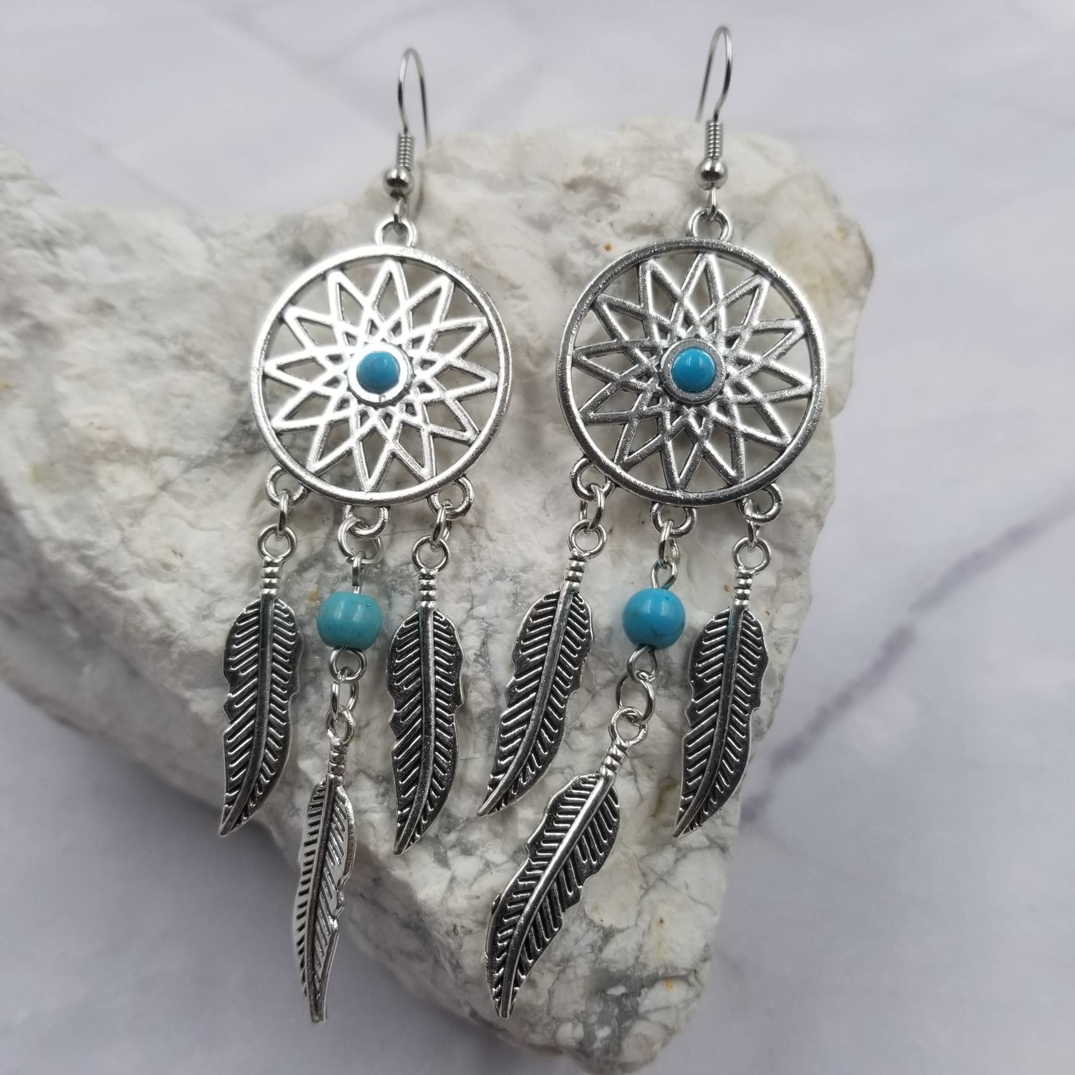 Keep it natural with the Wild Spirit Turquoise Feather Earrings. Featuring stunning silver pieces with cute feather detailing and Turquoise beading, these lightweight earrings enhance any look. - These beautiful dangle earrings come with fish hooks with rubber backs, keeping your earrings securely in place. - Our Earrings are perfect for any age range and would make beautiful gift for any occasion and easily accentuates any style. - Looking for the perfect gift? Our unique earring jewelry designs make this piece a wonderful present for wives, mothers, daughters and grandmothers. - All of our jewelry is nickel-free, lead-free, cadmium-free and is safe for sensitive skin. Perfect for all day wear! jewelry, western, copper, patina, spring, summer, gifts