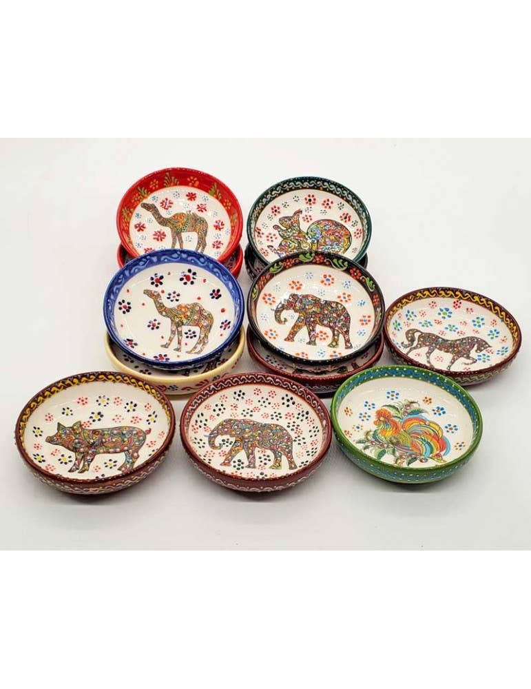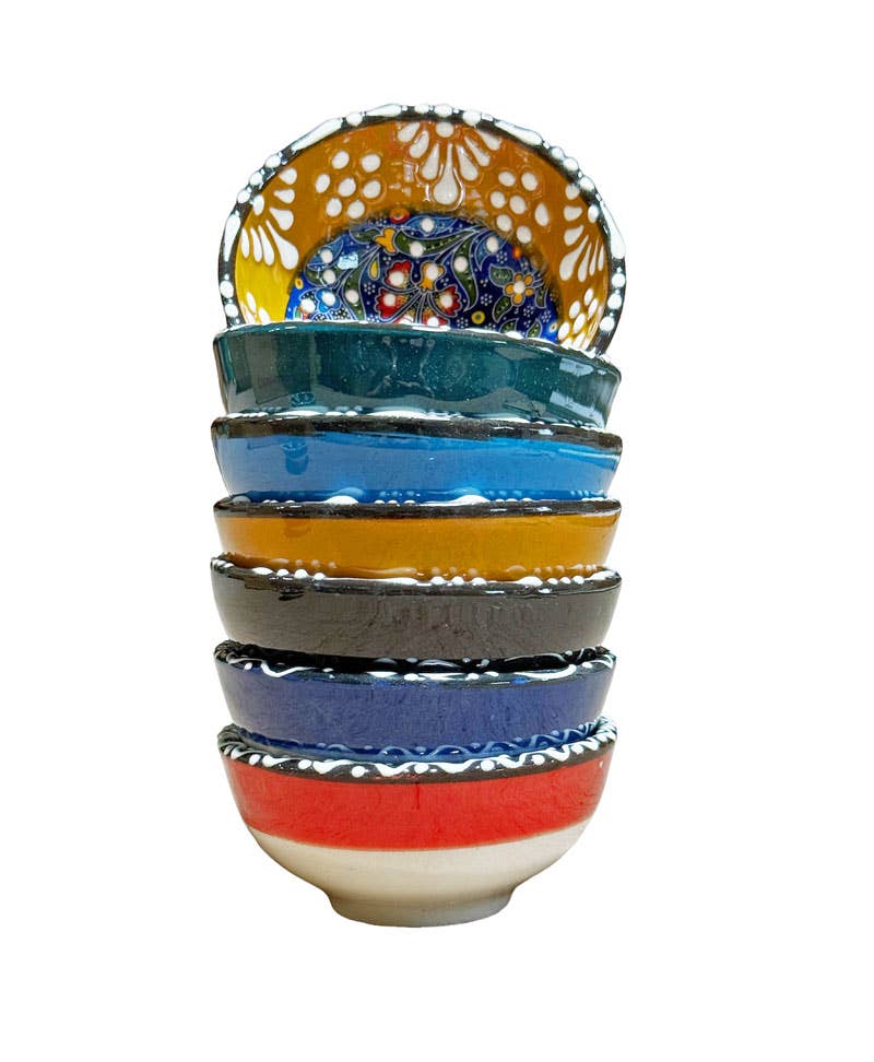 CBS3M Limited supplies. Hand-painted ceramics. Size: 3 1/4" diameter by 1 1/8" depth. The selection comes in assorted colors and designs. Minimum 144 Pieces. Best Value Perfect for spices, rings, knick knacks Each of them is prepared, made, and decorated with total care and dedication and by hand, minor variations in shape and size add individual style to our products.