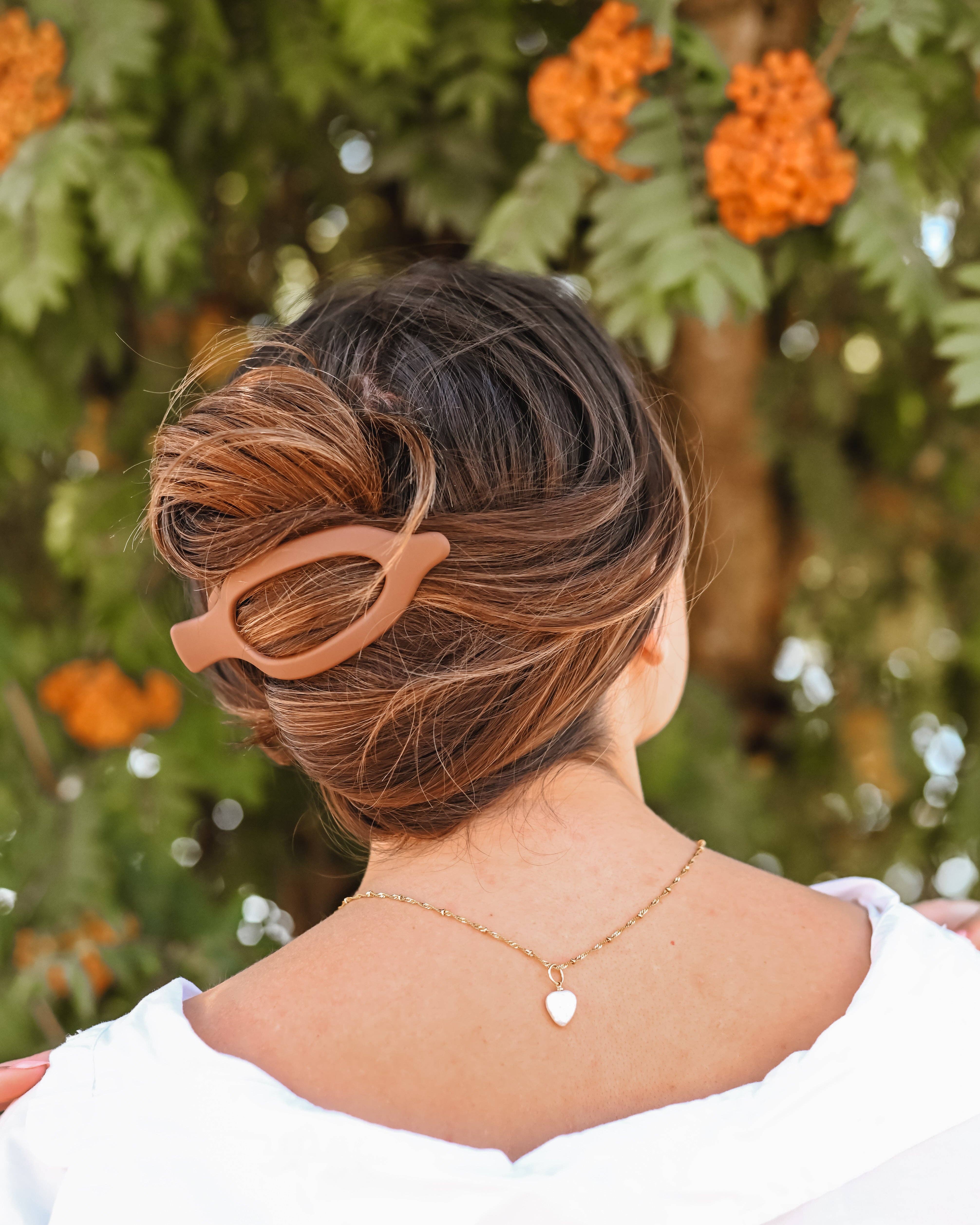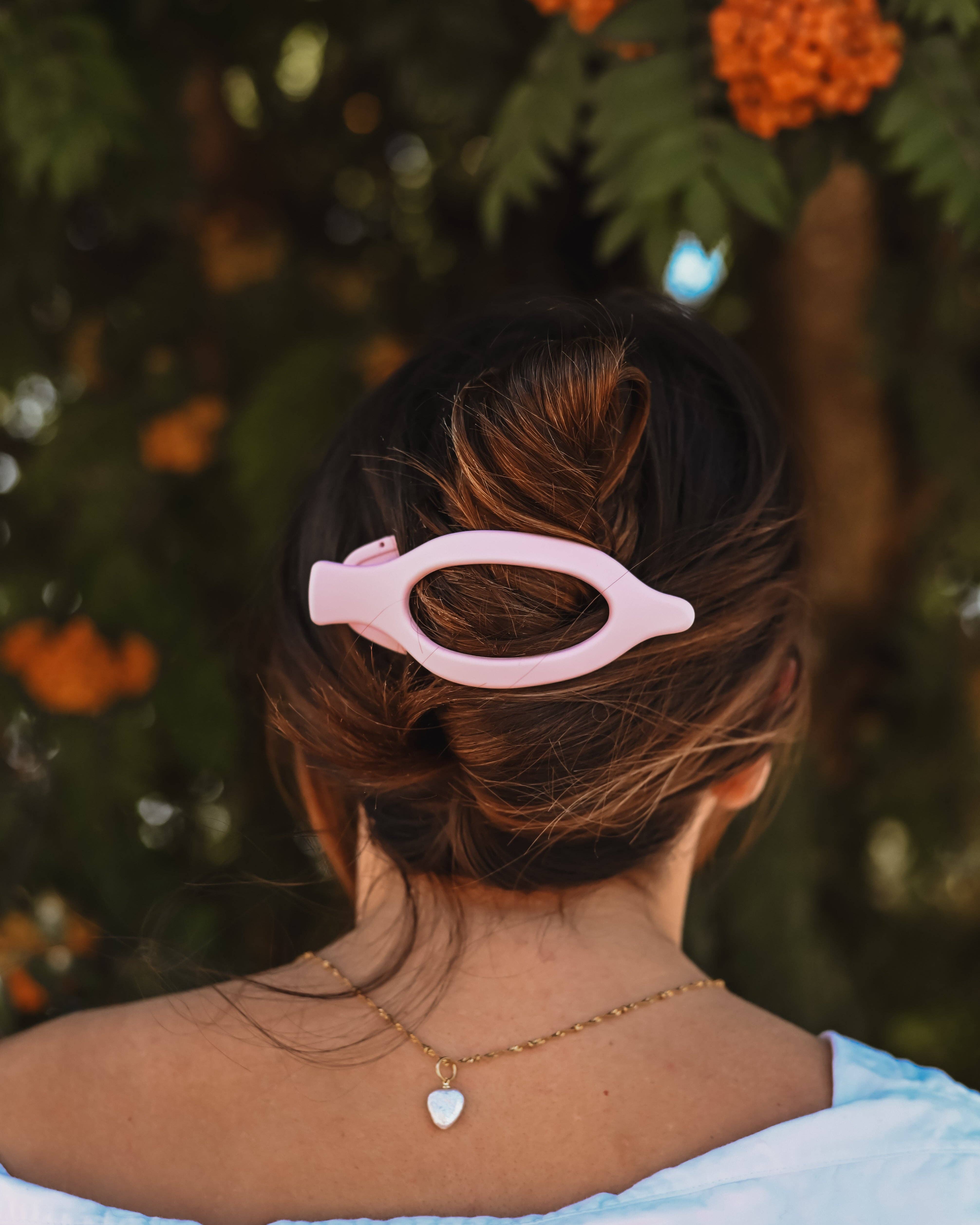 The Lay Flat Wide Clip is a fantastic clip for those seeking comfort, style and efficiency. This clip is best for driving, laying down and just overall relaxing due to its flat-laying nature. Say goodbye to your clip’s teeth digging into your head! Despite this clip’s purpose being for laying flat, the Lay Flat Wide Clip will also perform very well for day-to-day activities for the range of thin to thick hair. For those with ultra long or ultra thick hair, this clip will look and perform wonderfully with a half-up half-down hairstyle. Our Charm Pink Lay Flat Wide Clip is a light pink with a neutral undertone, matte finish and monochrome engraved logo on the inside. Length: 4 inches long