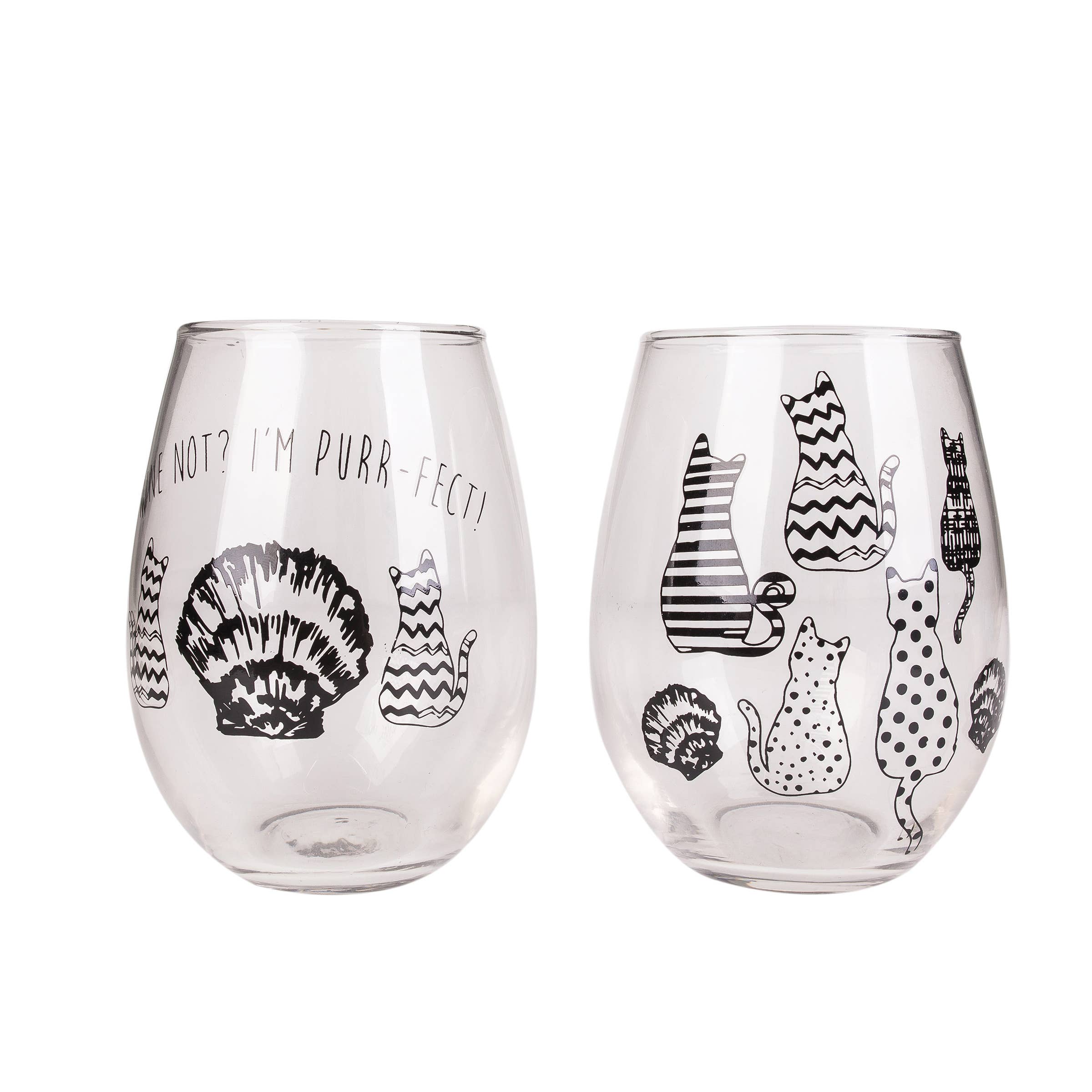 Purrfect gift for the cat lady or wine lover. The set of 2 stemless wine glasses, with clever cat lover sayings makes a great gift for your cat obsessed friends. The funny verses on the wine glasses read "It's Not Drinking Alone If Your Cat Is Home" and "Need Wine Right Meow" with cute cat themed graphics. The stemless wine glasses holds 18 ounces of liquid and are 4.75 inches tall by 3.25 inches in diameter.