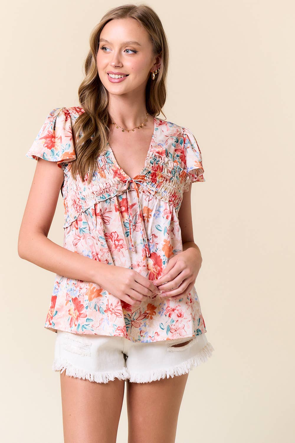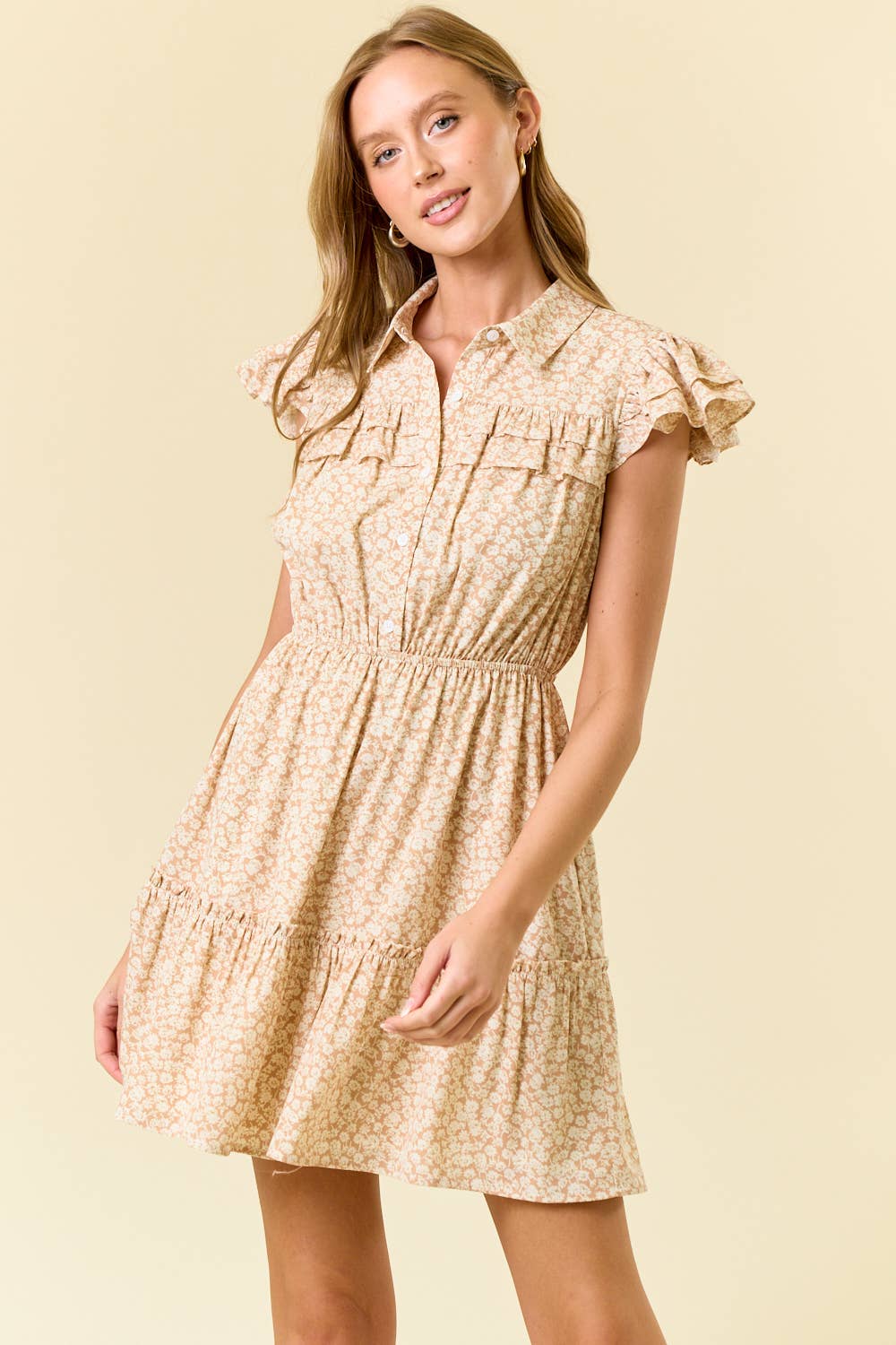 Square Neckline Flutter Short Sleeve Open back with Tie Babydoll Mini Dress - Babydoll mini dress with empire waist silhouette - Square cut with gathered detail - Flutter-style short sleeves with puff detail - Open back featuring tie closure and cutout detail STYLE MEASUREMENTS (SIZE SMALL) - TOTAL LENGTH 35" - BUST 17" - WAIST 14" 80%NYLON 20%TENCEL | LINING:100%POLY MODEL IS 5'10" | BUST 34" | WAIST 24" | HIPS 35" WEARING SIZE S