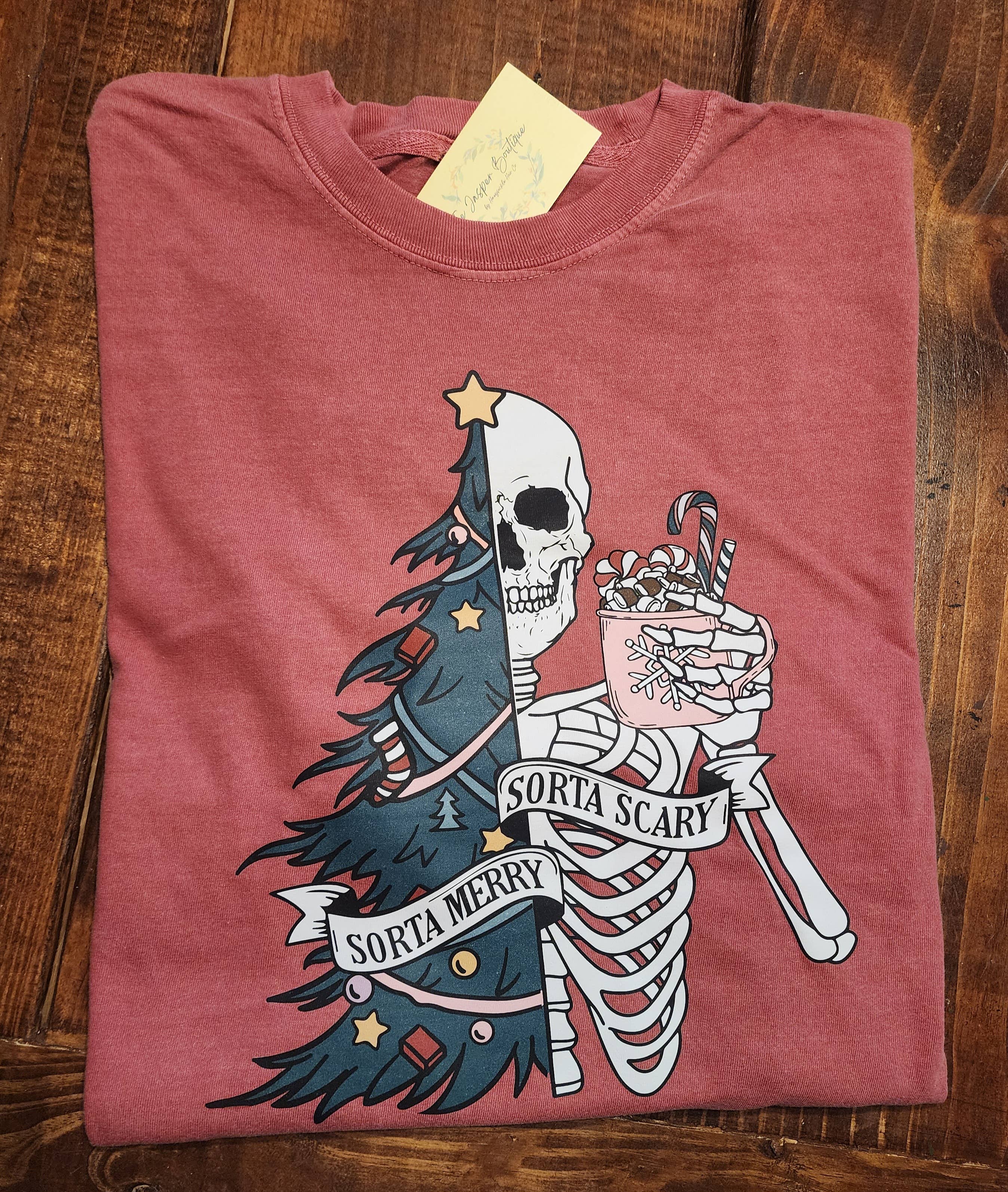 SORTA MERRY,SORTA SCARY,CHRISTMAS,SKELETON HEAVY COTTON UNISEX SHORT SLEEVE 100%COTTON SALVADOR