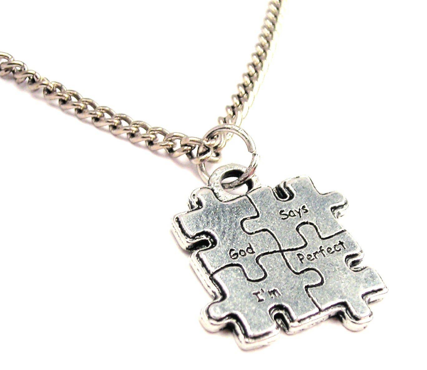 Wear these puzzle pieces with any style. The piece can also be worn as a sentimental piece for Autism Awareness. The stainless steel pieces have a length of 7/8 inches and have contrasting finishes. The pendant is paired with a 24 inch ball chain and encloses with a connector clasp.