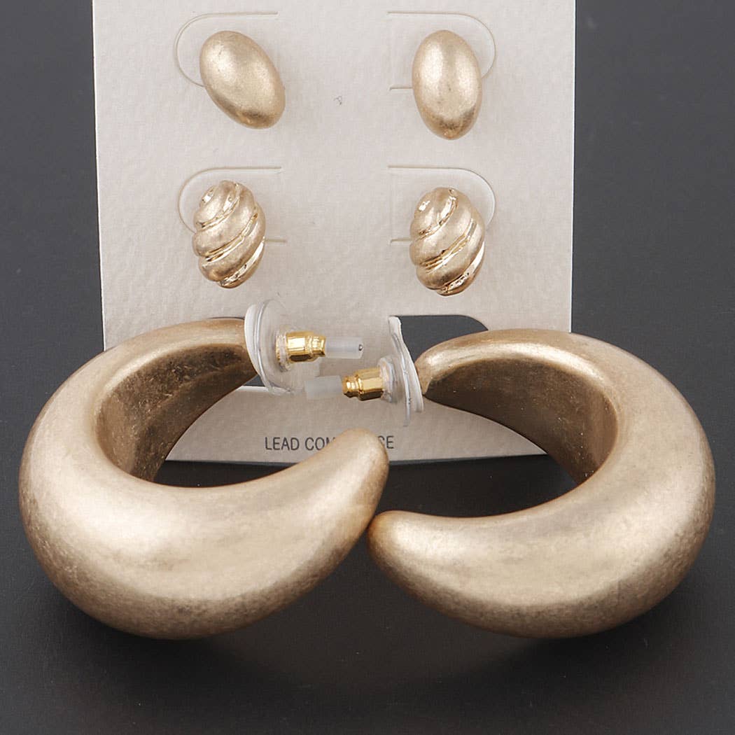 Gold Pearl Hoop Stud Trio Earrings, this trio features meticulously crafted earrings, combining the classic elegance of pearls with contemporary hoop and stud designs. Trio offers a variety of styles, allowing you to effortlessly transition from day to night. Product details: length: .75", .5", .35" width: .75", .5", .35" earring back: post metal finish: Gold Plating product: Lead & Nickel Compliant anti-tarnish: Double E-coating