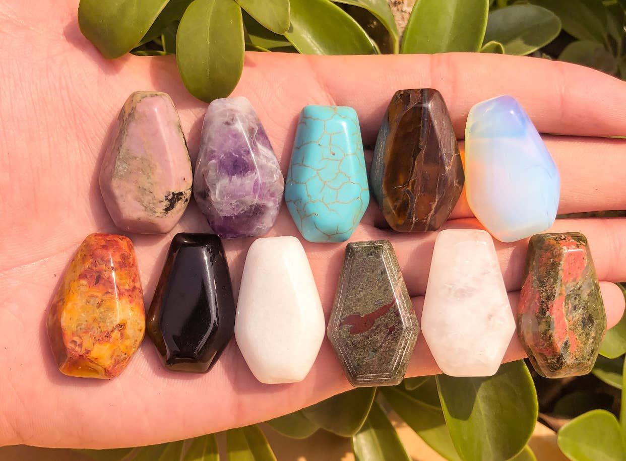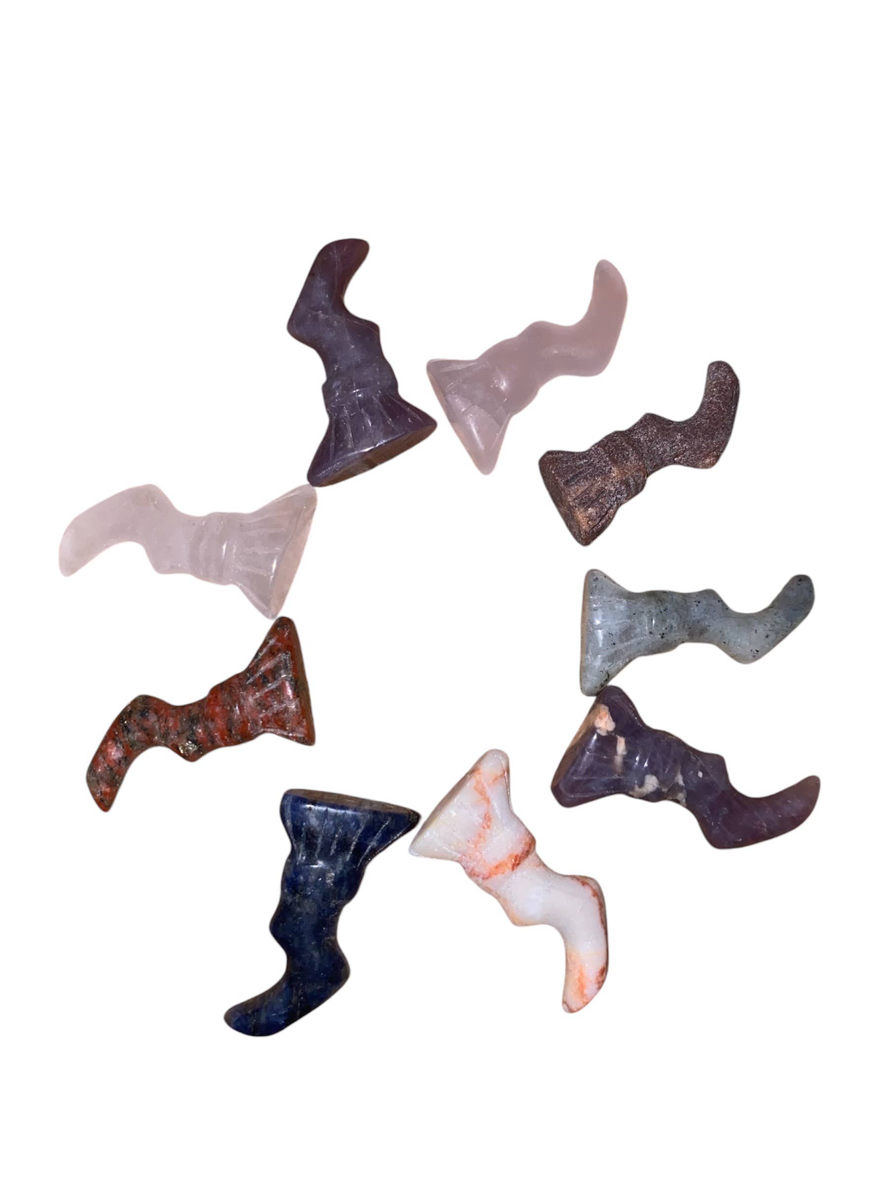 This is for a mystery set of 5 mini crystal bird skulls. The price listed is for 5 total crystal bird skulls hand selected randomly and may include any of the following materials : quartz, rhodonite, rose Quartz, moss agate, aventurine, obsidian, amethyst, flower agate, carnelian, fluorite, Jasper, agates, and many more! mini crystal skulls measure approximately 1”-1.5”