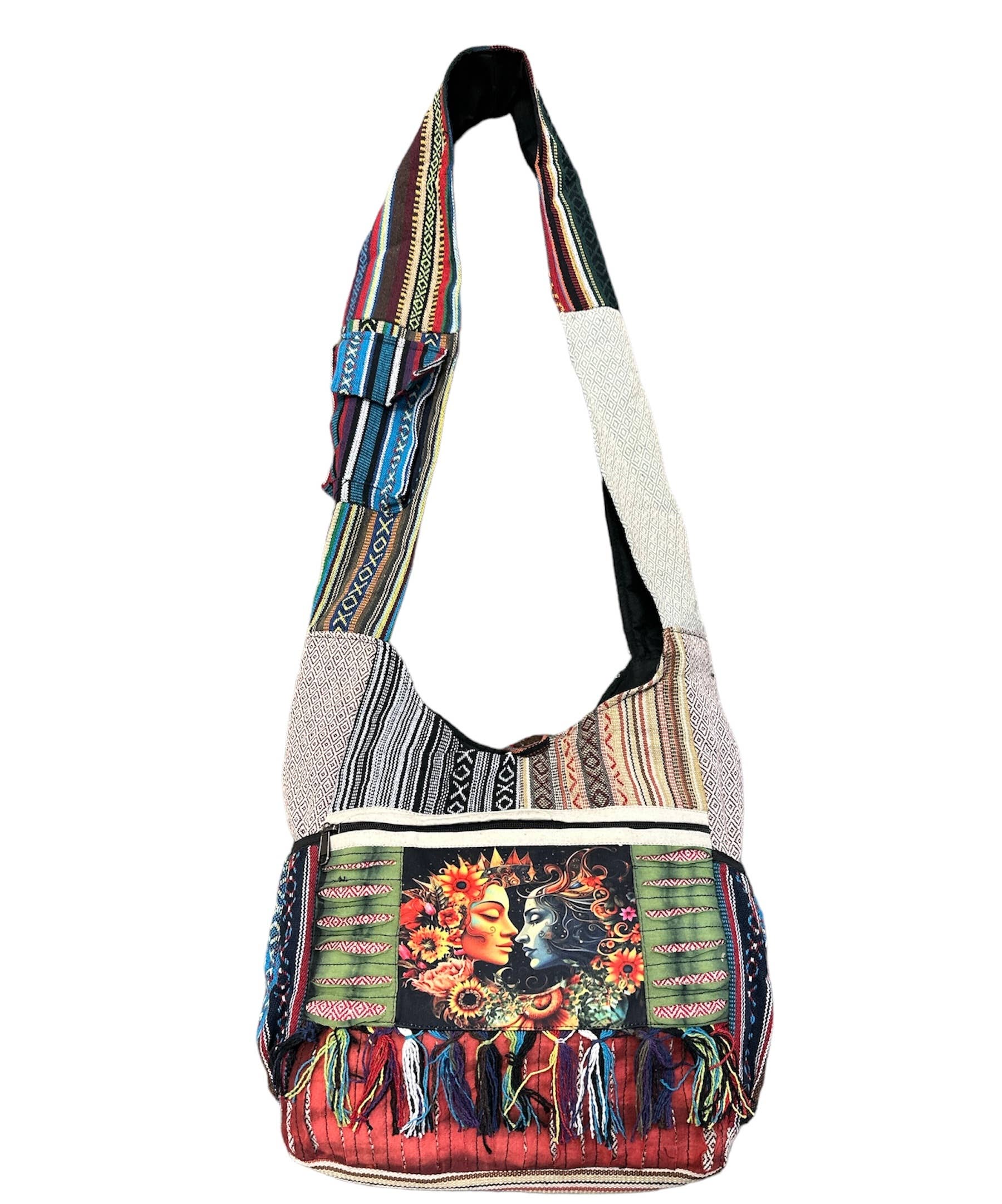 Our fully lined recycled military tent bag accented with unique vintage fabric & textile pieces features long backpack-style carrying straps, a top main zipper, 2 front exterior large open pockets and 1 interior zip pocket. DISCLAIMER: Our recycled military tent bags are a tribute and a reminder of the sacrifices and contributions of military veterans. Please know that these bags are made from authentic used military tents not brand-new canvas packaged as recycled tents or tarps. THESE ARE THE REAL DEAL! As a result, the tent material will show signs of worn-like imperfections which add to its character. Each bag has differences in genuine imperfections, stains, and colors. Your bag will be as unique as each soldier's experience when seeking shelter in these tents whether in the training field or in a combat zone. Vintage fabrics are not repaired, they will have distinctive characteristics of worn threads, sequins and or beadwork. No two bags are alike. All Sales Final