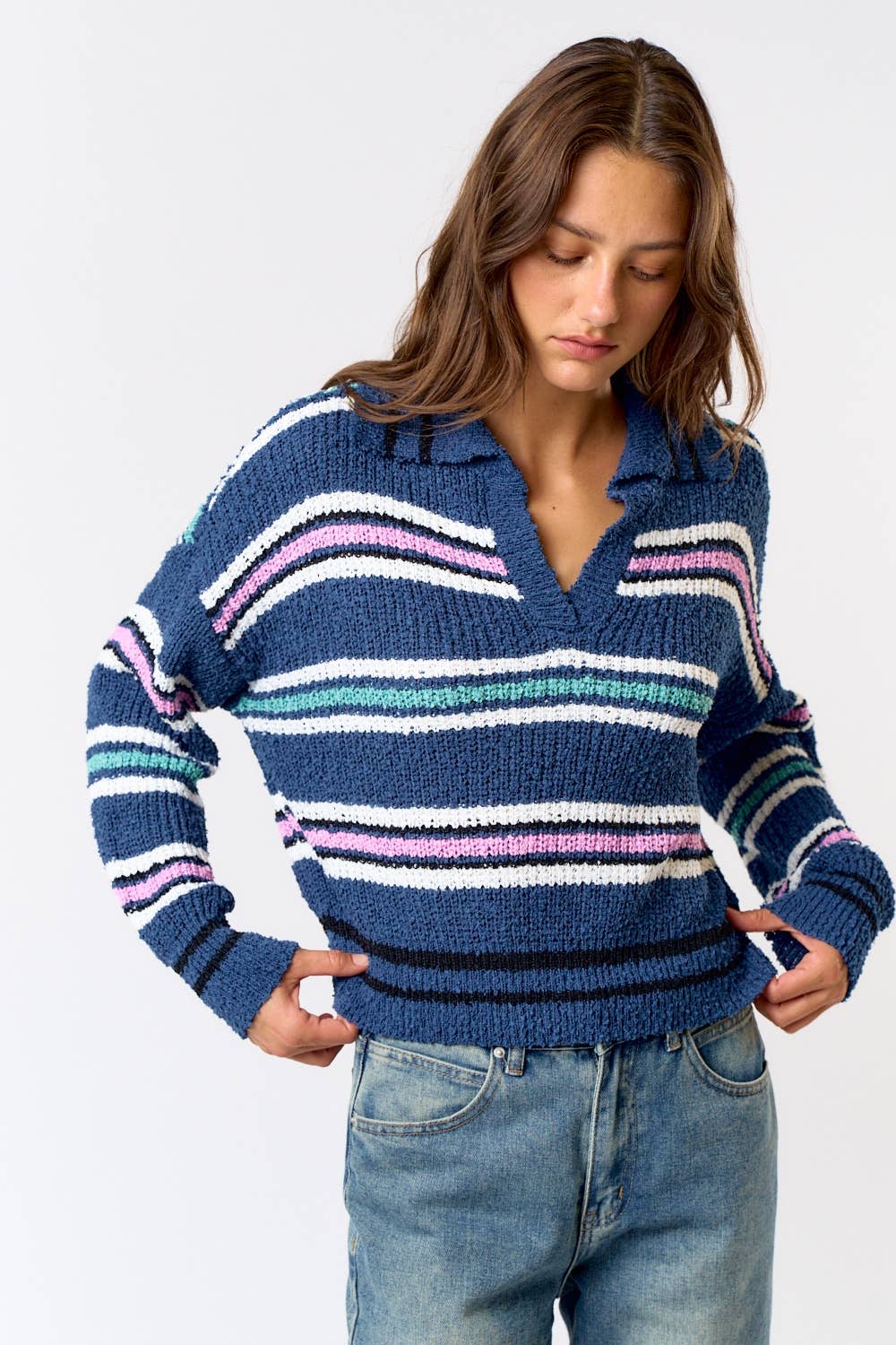 FWT12027 Colorblock cropped half zip sweater. The editorial model is 5'8" and ecomm model is 5'10" and both are wearing size Small. - Collared - Half zipper closure - Slightly cropped - Striped color blocks - Ribbed trims - Unlined Shell: 60% Cotton, 40% Acrylic Lining: N/A