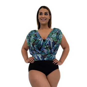 PLUS SIZE TROPICAL PRINT COWL NECK FITTED TANK TOP. 96%POLYESTER, 4% SPANDEX.