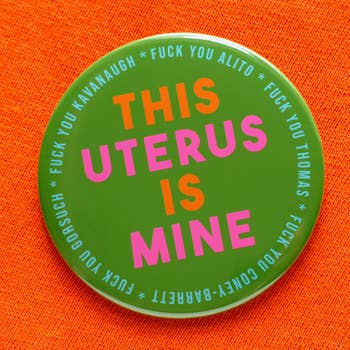 2.25" x 2.125" pinback button. Hand pressed by me. No packaging.