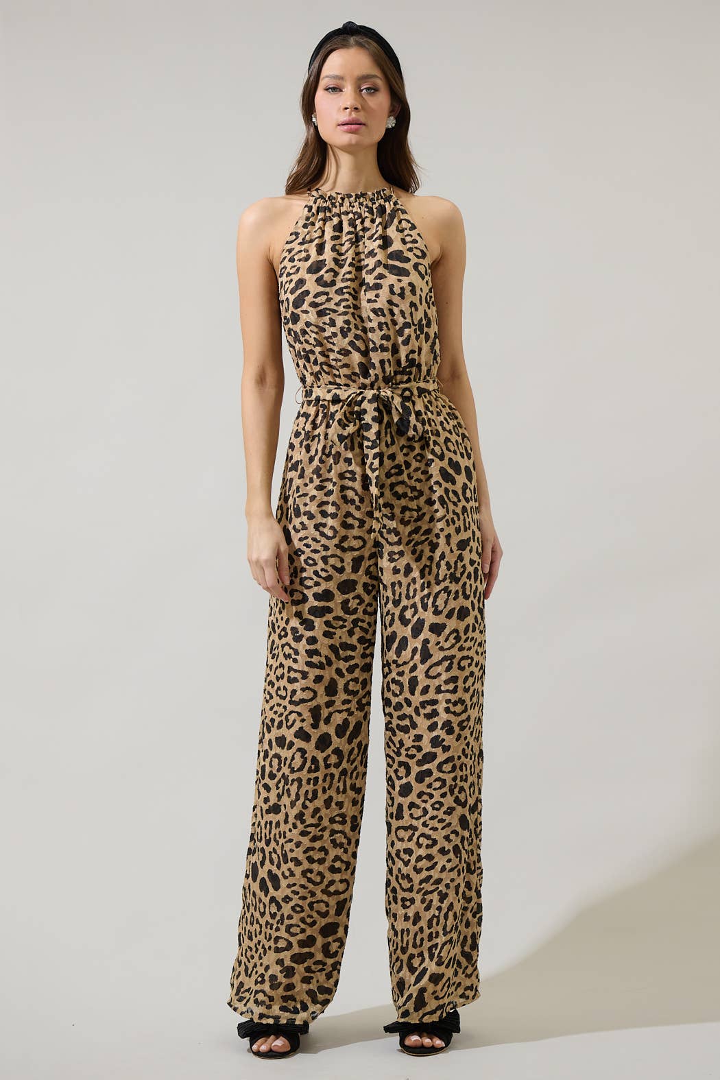 Leopard printed overall jumpsuit with contrast band on the side. Also available in sizes S to L: Style no. IP17873. Total Length: 51 1/2" Content: 100% Polyester