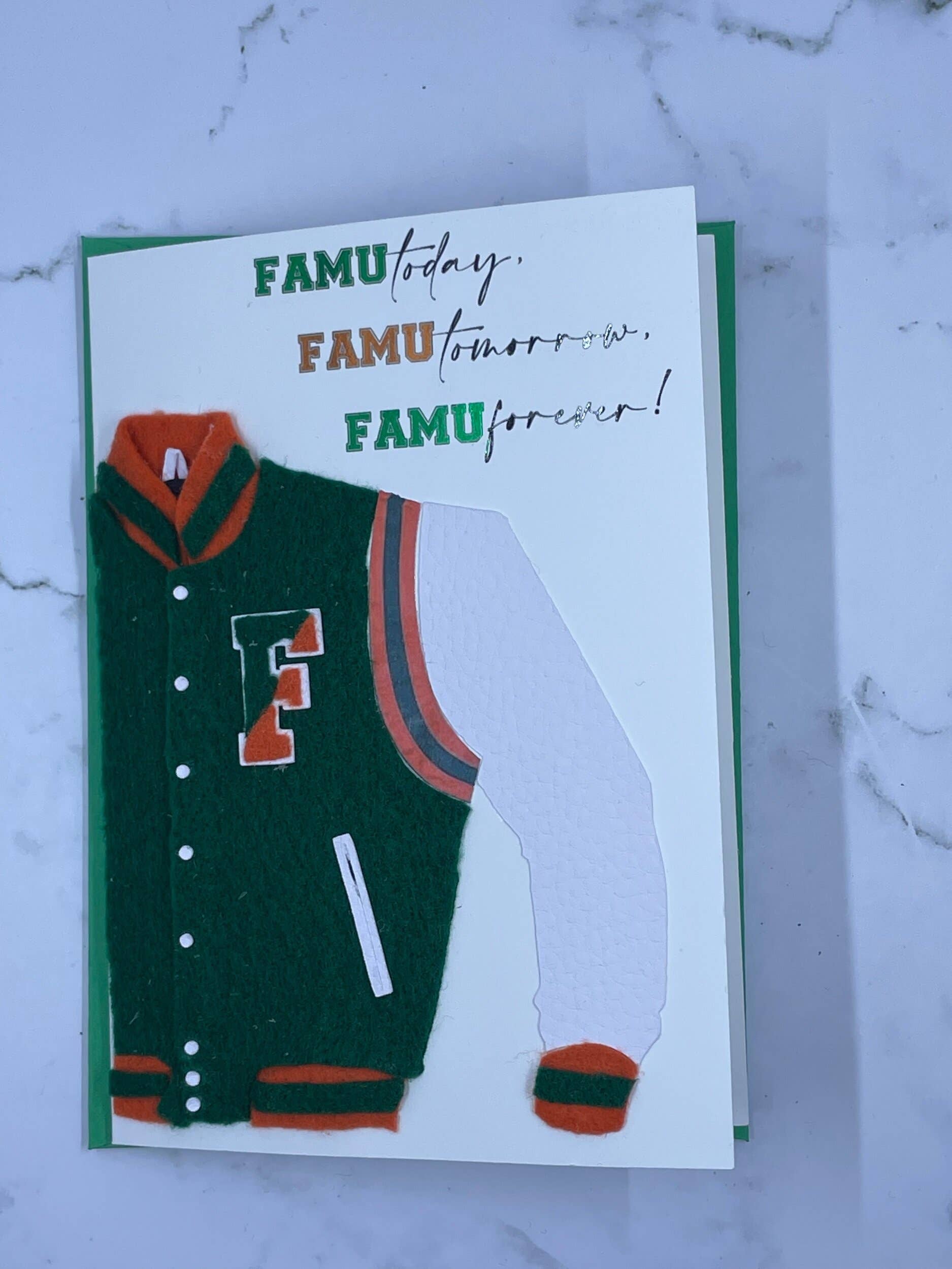 You have a friend or loved one that has accepted the rare opportunity to join so many on the hill of Florida A M University. So what better way to welcome them to the campus, dorm or apartment than with this card.Take a closer look: this is our FAMU welcome to the hill card. Made on white 110lb card stock, a printed image of a Drum Major on a football field along with white text accents on the outside and green foil accents on the inside.Customize this card with your own personal touch in the messaging on the outside or inside message. You may also choose to order it blank to write in your own message. This card comes with a coordinated envelope as well.Disclaimer: as all cards in the D. Johnson Co Greeting line are handmade and custom, you can customize this card to your specific needs or desires.
