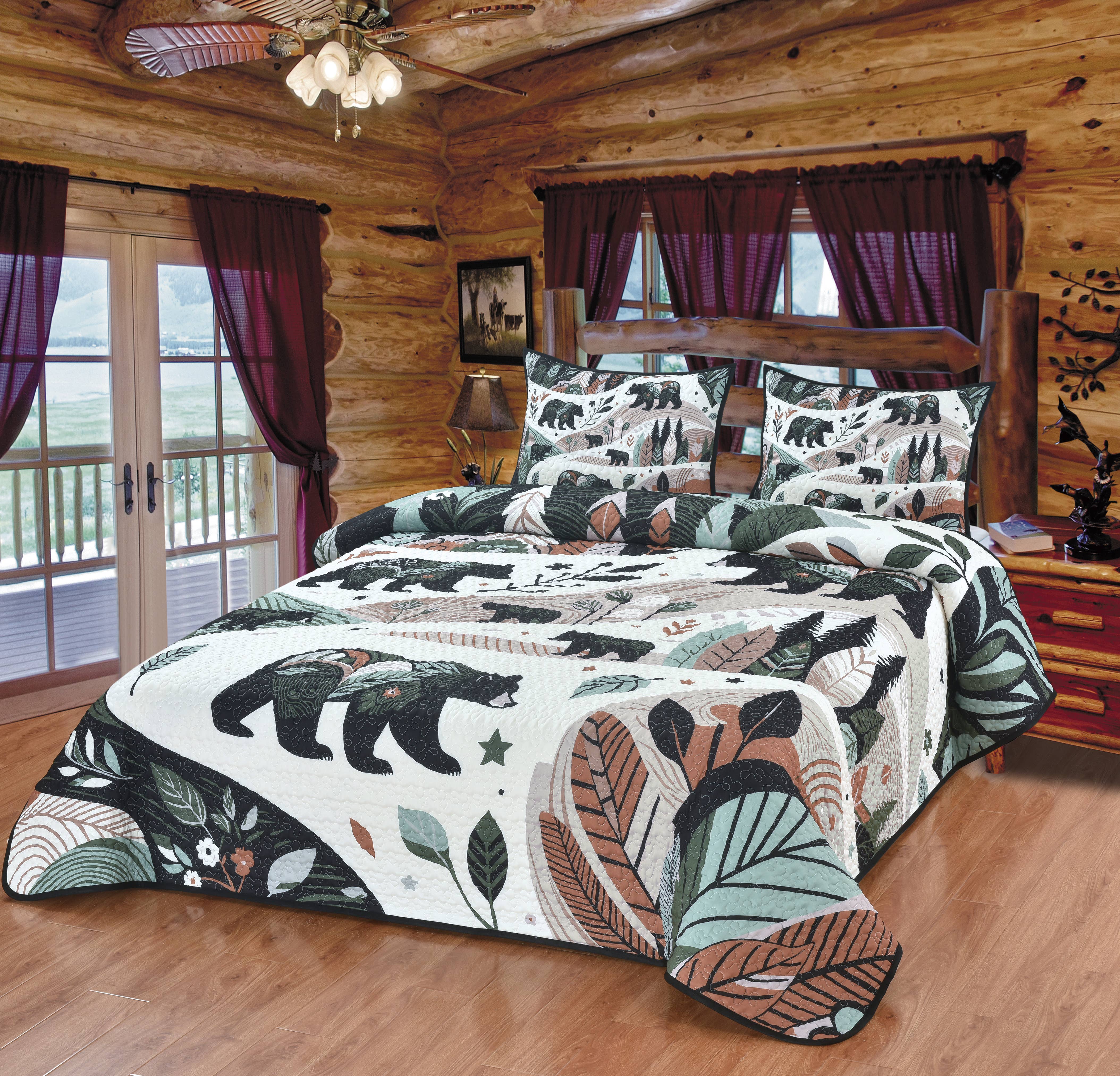 This fetching and rustic 3-piece quilted microfiber bedding collection features a black bear and her cub, surrounded by pine trees, birch limbs, and forest plaid. Colors include taupe, olive green, charcoal, white and ivory. Our coordinating shams and accent pillows complete the collection. This quilt set has a soft hand right out of the package and is just the right thickness to keep you warm or cool, depending on the season. The vivid colors are great for a master bedroom or guestroom. Accessories sold separately. Machine Washable. Dimensions: Twin 2pc Set 68x90", Sham 20x26" Queen 3pc Set 90x90", Shams 20x26" King 3pc Set 110x96", King Shams 20x36" Dec Pillow Plaid 11x22" Dec Pillow Tree 18x18" Material Content: 100% polyester