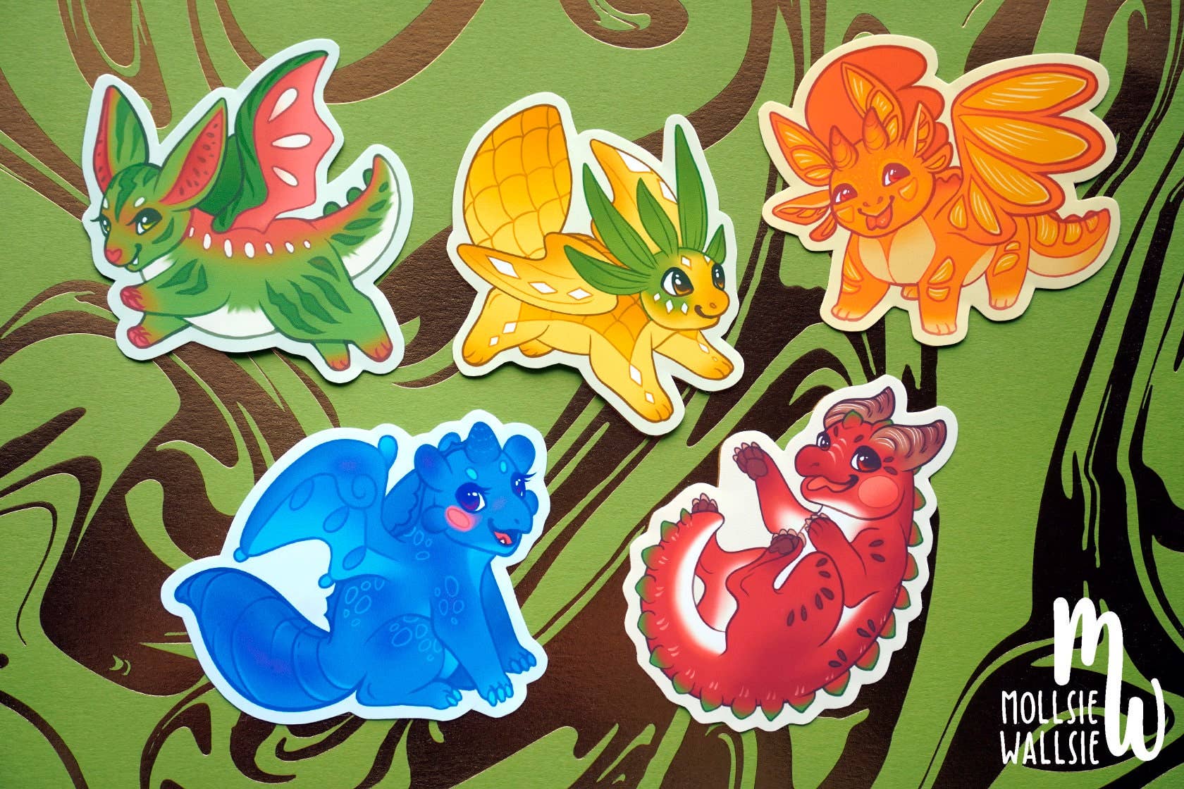 ★ Autumn - the season of smoky firewood, toasted marshmallows, warm cocoa, and plump pumpkins! ★ These baby Autumn Dragons just want a friend to cuddle up with in the cozy season. This is a set of 5 glossy paper or matte vinyl paper dragon stickers. They're perfect for decorating phone cases, notebooks, computers, tablets, or however you want! ♥ Each sticker is about 2 inches x 1.5 inches. ♥ You can choose to get them as individually cut stickers, or as a kiss-cut sticker sheet ♥ The stickers are printed on either vibrant matte vinyl paper or glossy paper that's water resistant. Art Sites - https://mollsiewallsie.carrd.co