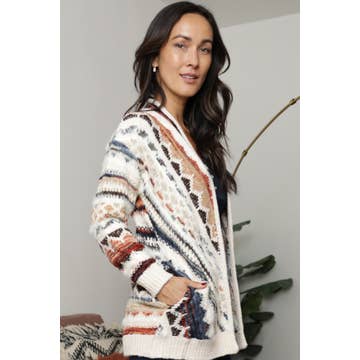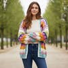 "This playful colorful cardigan features a distinctive bubble stitch design brought to life in a vibrant rainbow palette. Designed with an open-front silhouette and a relaxed fit, it offers easy layering and all-day comfort. The chunky cardigan texture and softly structured balloon sleeves add dimension and warmth, making it a standout cardigan for women that transitions effortlessly from casual daytime looks to cozy statement styling. Material: 100% Acrylic Size: L – Length 29"", Width 22"" Print: Rainbow Imported"