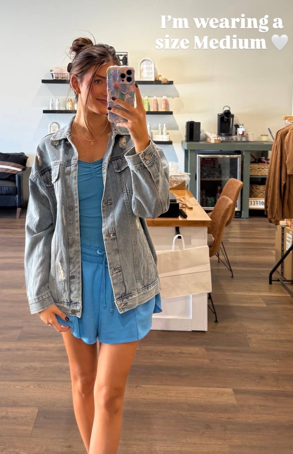 -Medium wash denim -Oversize trucker jacket fit -Distress detail on font /back and sleeve -Button closure with collared neck -Long sleeve with button cuff -Imported Machine wash cold 90% Cotton 10% Polyester Model is 5'9" and wearing a size Small