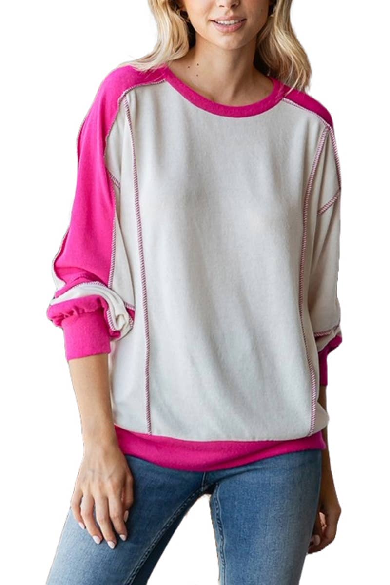 ETK-7955 Hacci Brush Color Block Casual Top