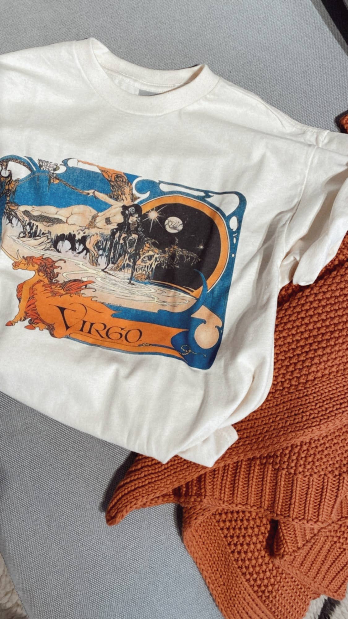 Authentic 1970's zodiac artwork wows with this unique and vibrant portrayal of the nurturing water sign. 100% ring spun cotton is both soft and sturdy in this unbleached organic tshirt. Our Zodiac series makes a thoughtful, unique gift or perfect addition to a vintage or celestial lovers wardrobe. -5.4oz organic ring spun cotton, printed in TX -Preshrunk cotton, unisex sizing -Unbleached, undyed Cotton Color appears light off-white with natural speckling Model is wearing size small Please note, the artist is Spanish and all zodiac signs are written in Spanish.