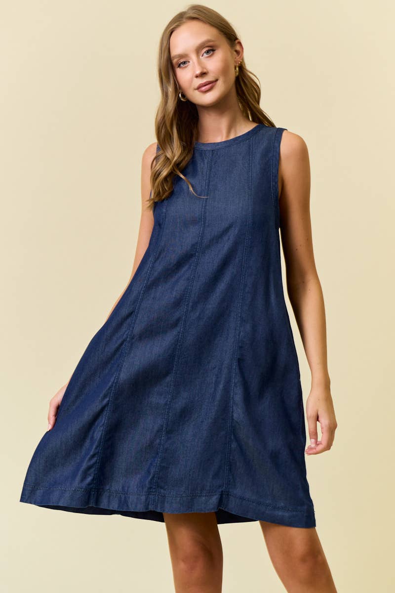 Dress - Navy Textured, Tiered Tank Dress, Tie Detail, Ruffle Neck, Knee Length Dress