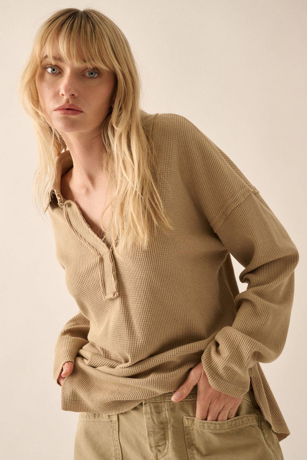 HENLEY THERMAL KNIT TOP FEATURES: - HEAVYWEIGHT THERMAL FABRICATION - CONTRAST SLUB KNIT ACCENTS - TORTOISE FUNCTIONAL BUTTONS - GARMENT WASHED FOR THAT GENTLE LIVED IN FEEL