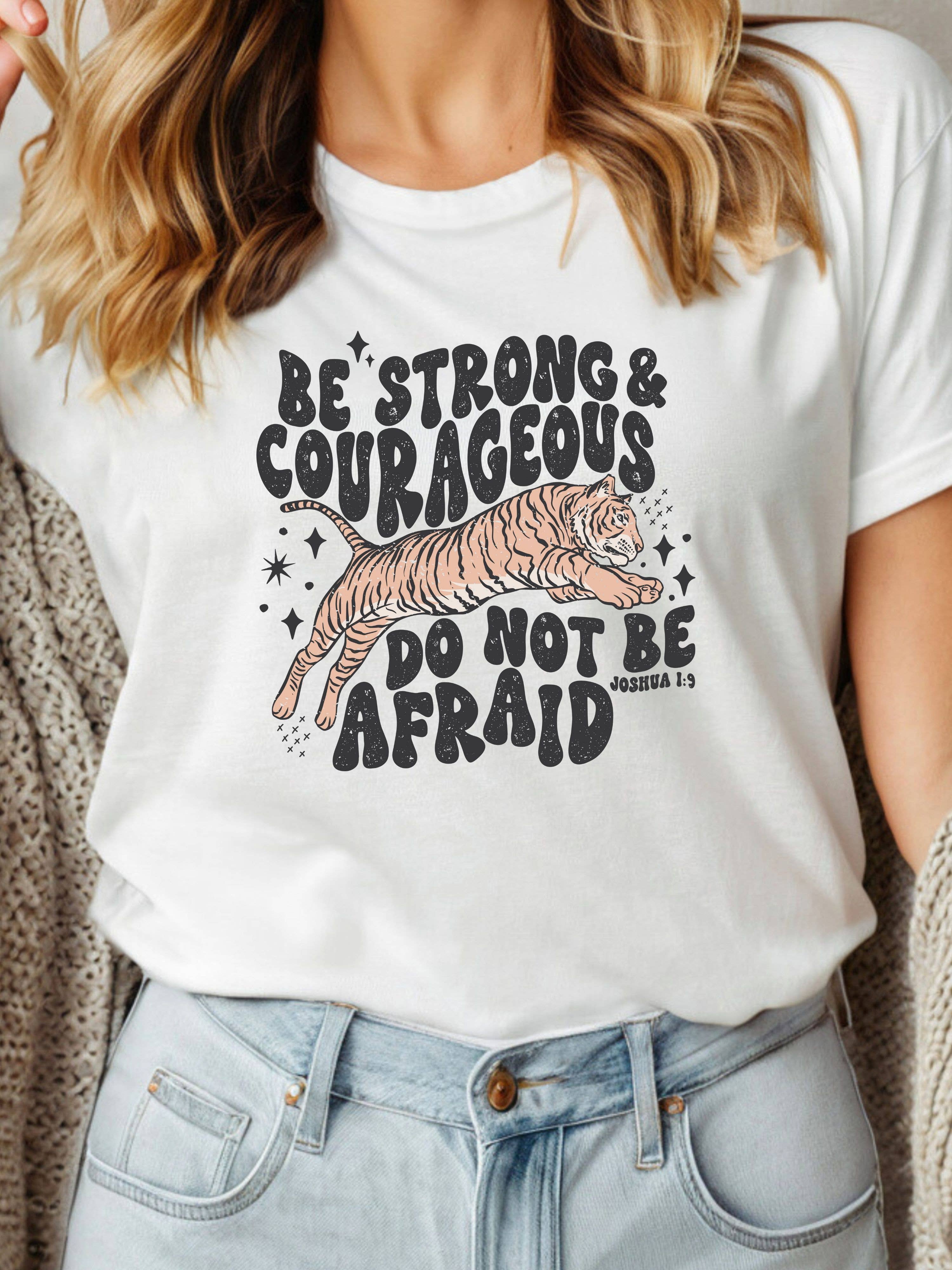 Make a bold statement of faith with this empowering tee featuring a fierce tiger and the words from Joshua 1:9 — "Be strong & courageous, do not be afraid." Printed on a soft and garment-dyed Comfort Colors tee, this shirt combines inspiration with a vintage-style design that’s easy to wear and layer year-round. Perfect for everyday wear, youth groups, church events, or as a thoughtful gift for someone who needs a little courage.