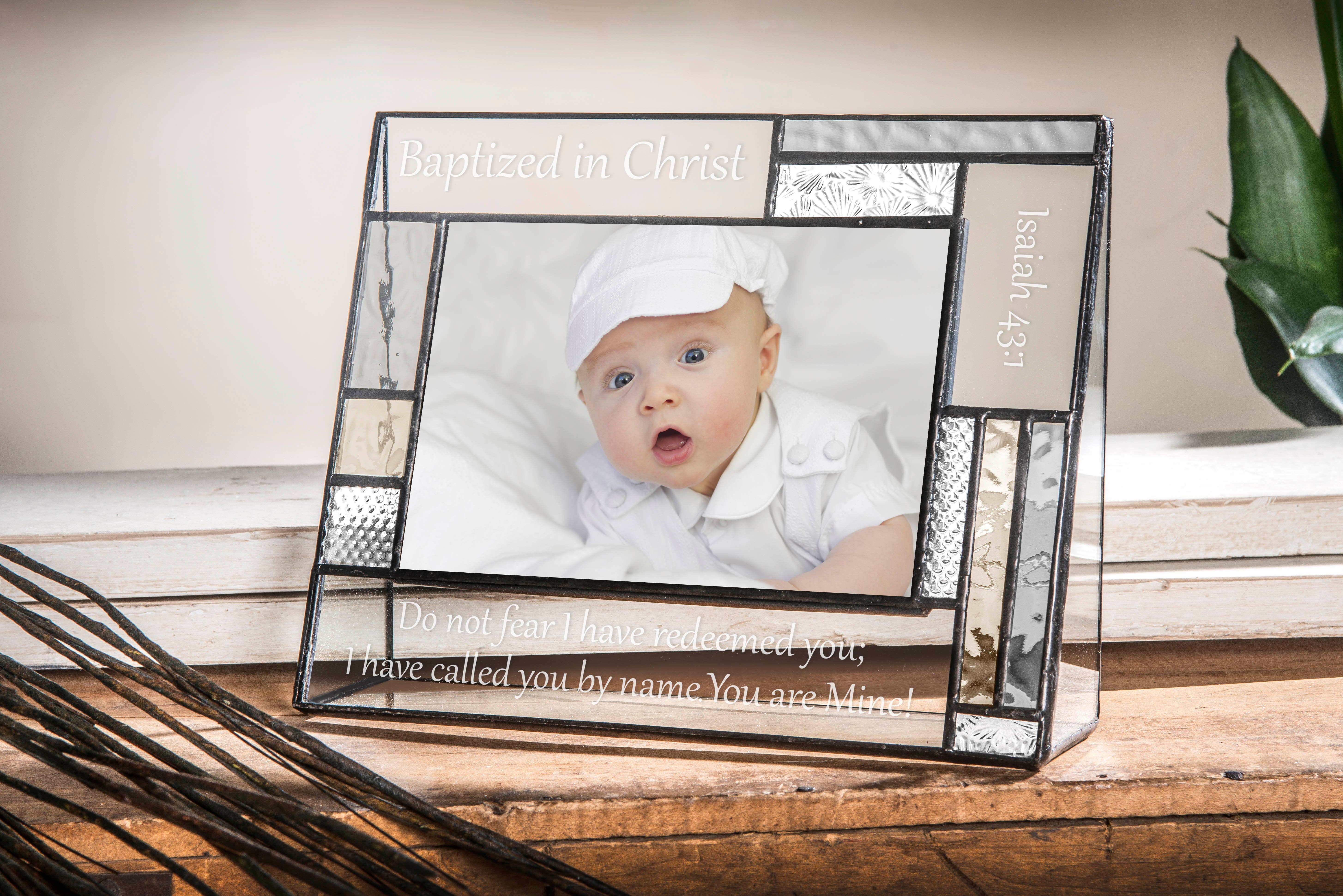 Baptism picture frame crafted of MDF with distressed wood look on base. Complete with baptismal blessing. Featuring cast metal scallop shell charm in pewter finish, hanging in cutout. Holds 4" x 6" photo. Boxed.