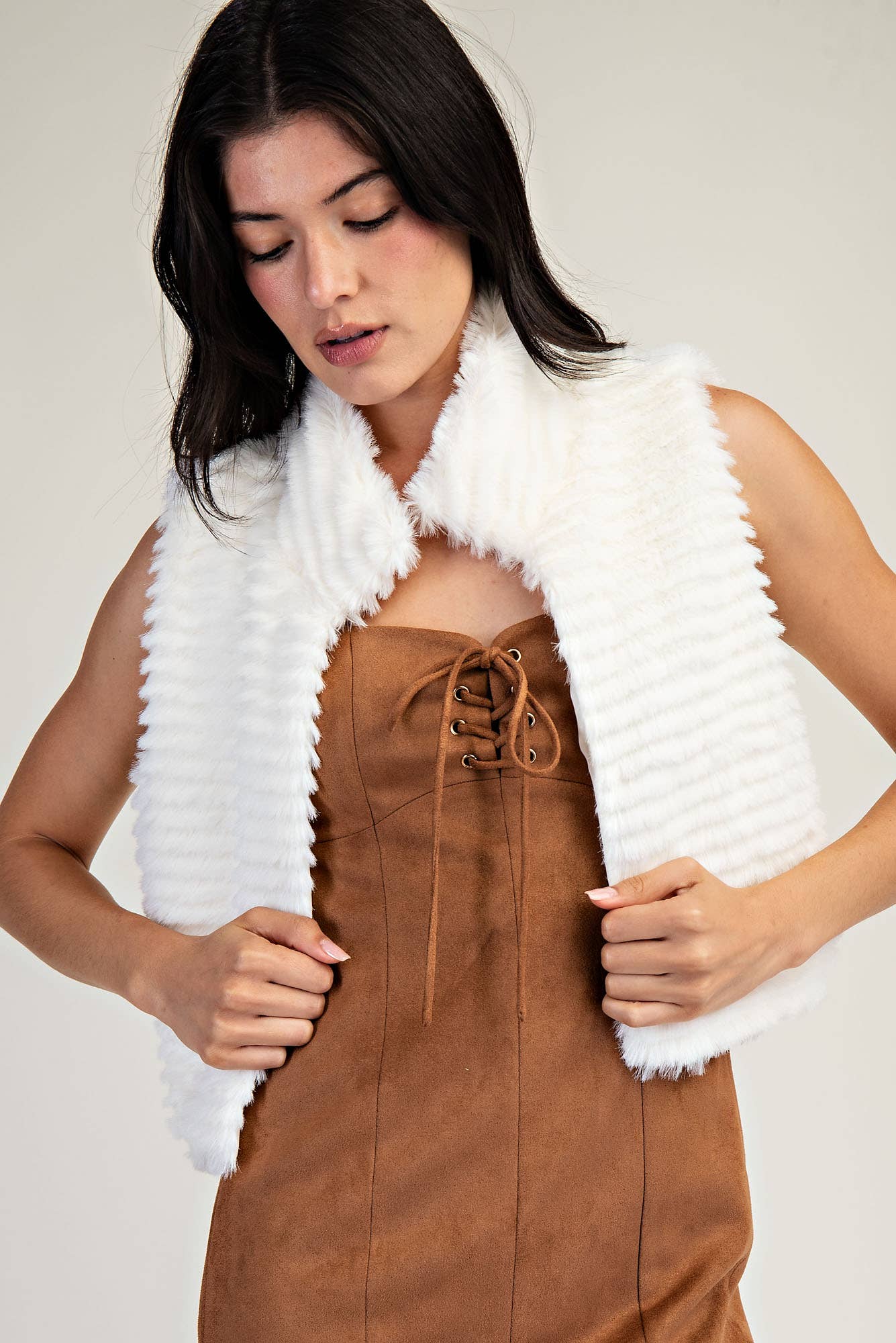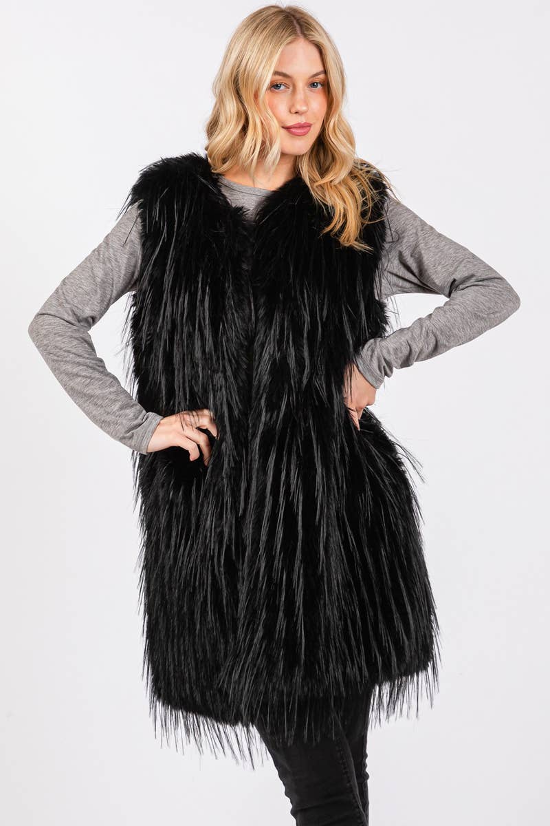 Satin Lined Like Luxe ImitationGoat Fur Semi Length Vest +The model is 5' 7" and wearing a size OS +Bust-Waist-Hip Measures 34"-23"-34"