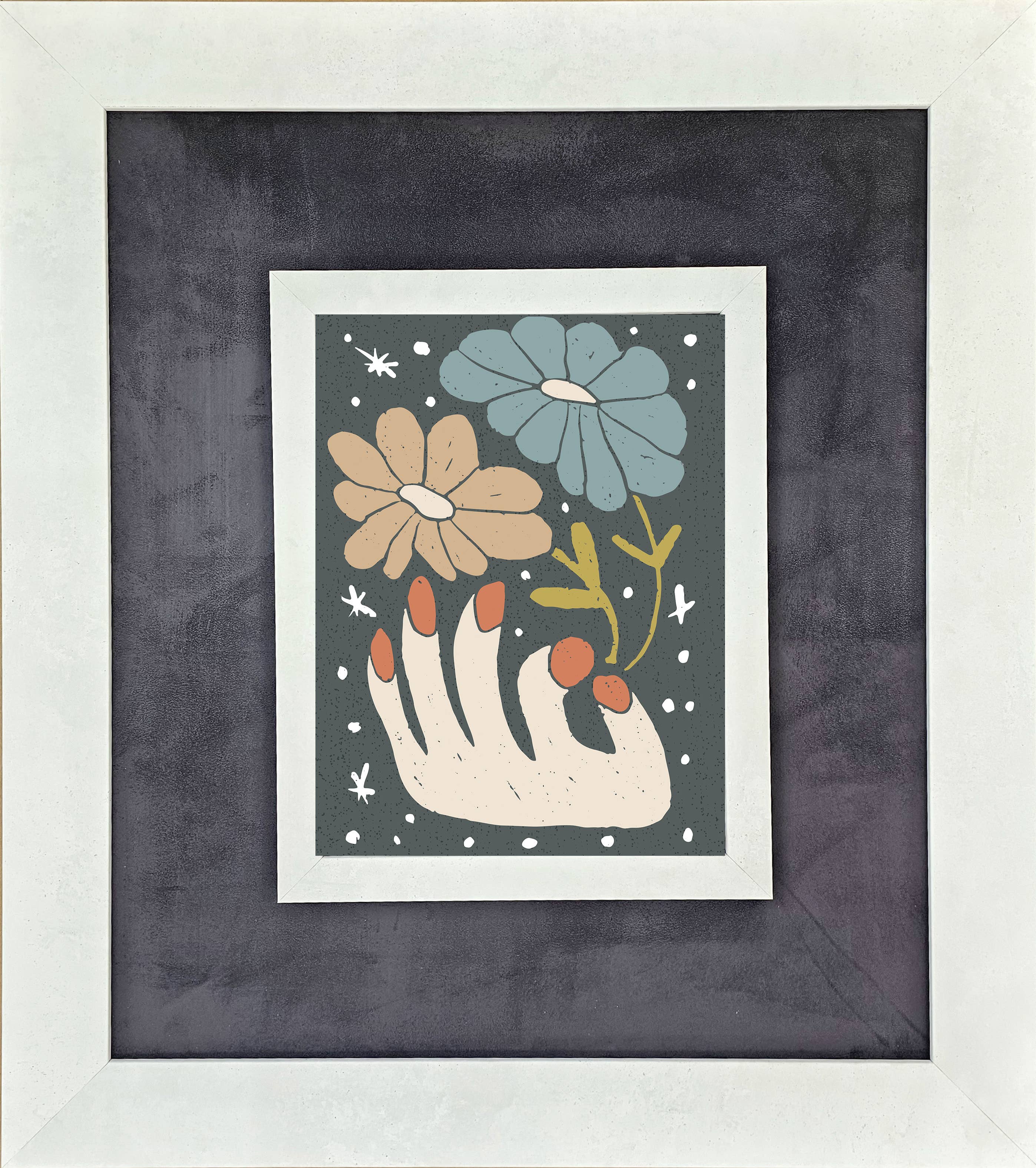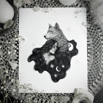 Elevate your home's aesthetic with this art print of a black crescent moon adorned with gold sparkly stars. A delicate hand gently cups a bouquet of vibrant flowers, accented with crystals at its center. The background is a cloud of magical colors, creating a dreamy and enchanting atmosphere. Perfect for hanging in your bedroom. • Printed with vivid colored inks on cotton canvas mounted on wood • Solid hardwood frame in shown stain colors • Sustainable American sourced wood • Made in the USA in our Utah studio • MINI 6" tall x 6" wide x 1.25" deep w/ 1/4" thick frame • SMALL 11" tall x 11" wide x 1.25" deep w/ 1/4" thick frame • MEDIUM 15" tall x 15" tall x 1.5" deep w/ 3/4" thick frame • LARGE 22" tall x 22" tall x 1.5" deep w/ 3/4" thick frame • Signs may have +/-1" variations • All signs can stand on a shelf or table (Medium & Large can also hang on a wall) • Farmhouse style frames have small rustic imperfections that make them unique