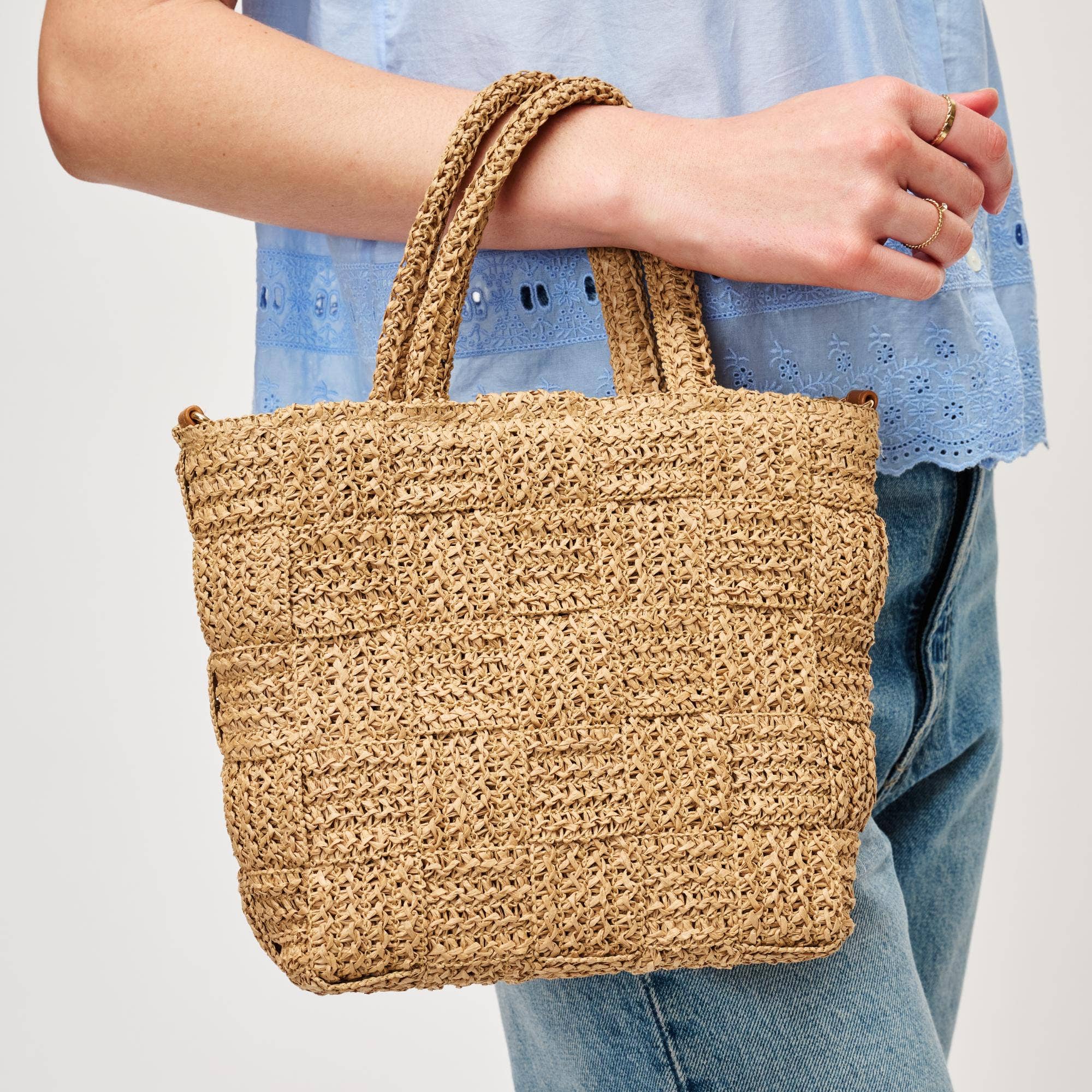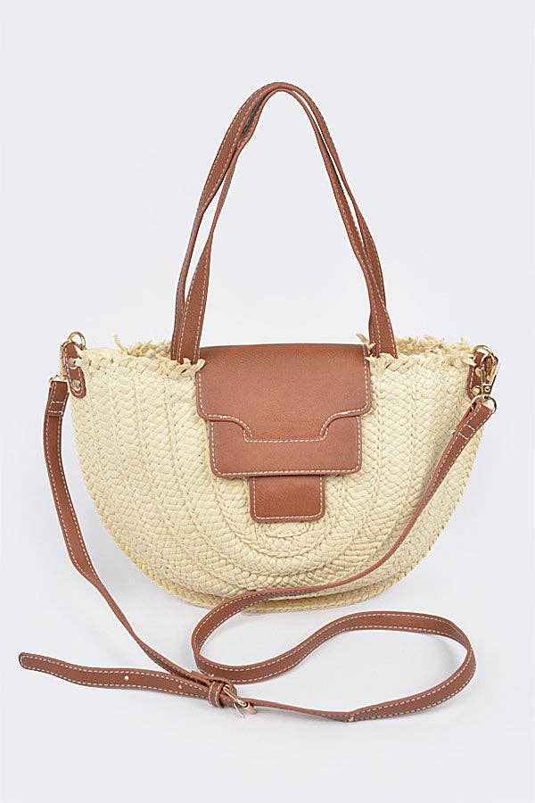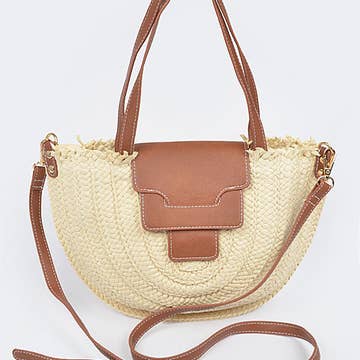 This hand bag features a fashionable intricate braided wheels style with a removable inner pouch. Discover the perfect balance of subtlety and flair as this hand bag effortlessly completes your look. This hand bag approximately measures (Inches): L: 9 Depth: 3 H: 6 Handle/Strap: 7-22 70% PAPER 30% POLYESTER