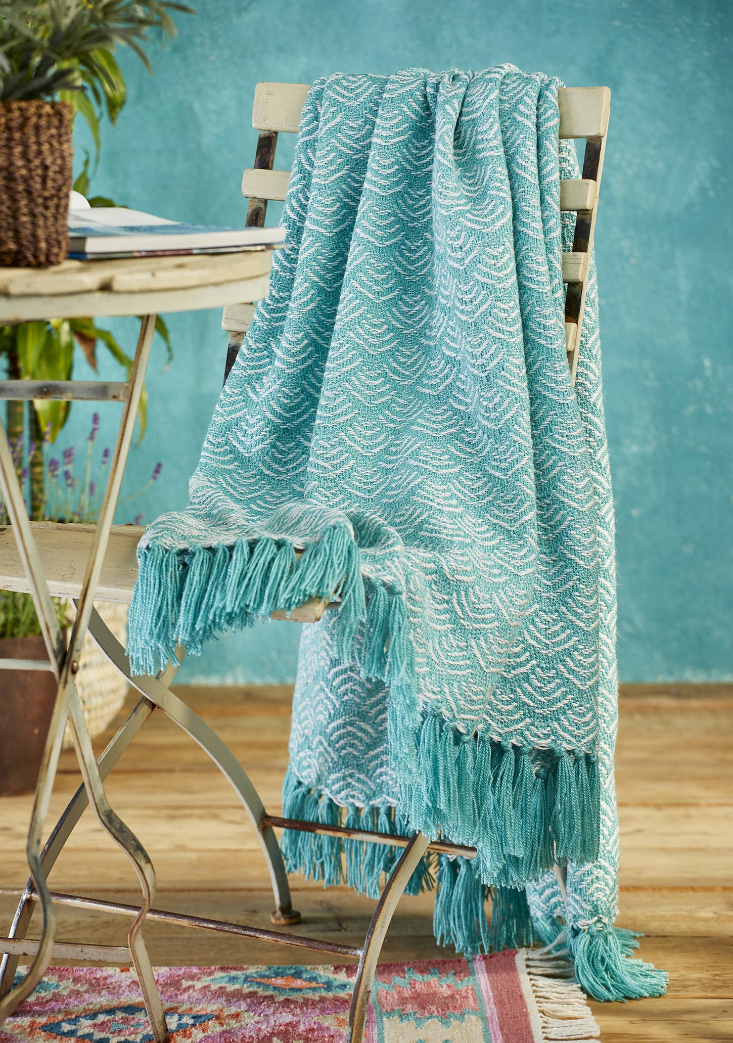 A zig zag multi colour patterned throw with matching end fringes. Woven from a yarn derived from waste plastic bottles, this eco friendly delight is the perfect indoor/outdoor throw. It offers natural stain and UV resistance, and no home for dust mites. A versatile fabric for indoor or outdoor use, it is soft to the touch, washable and quick drying. Use indoors for warmth and decor, as a garden throw, picnic blanket, at the beach or by a swimming pool. 125 x 150cm 100% PET Yarn made by a process that breaks recycled plastic water bottles down into super fine fibres to be spun into yarn and thread. We recommend surface cleaning PET yarn with a damp cloth to maintain in the best condition. Where a machine wash is required, accessories are available from major retailers to prevent shed fibres entering the drainage system. Use a liquid detergent on a short, cool setting without fabric conditioner. Avoid vigorous spin cycles and hang to drip dry.
