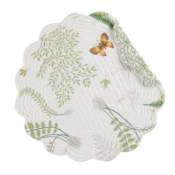 Enhance your dining table with the Golden Acres Placemat, featuring four elegantly crafted placemats made from soft cream-colored cotton fabric. Each round placemat measures 15 inches in diameter and showcases a charming quilted design with scalloped edges for a classic touch. Delicate yellow flowers with green stems are beautifully printed across the surface, adding a fresh and cheerful aesthetic to your table setting. Perfect for everyday use or special occasions, these placemats provide both style and functionality to protect your table while elevating your décor.