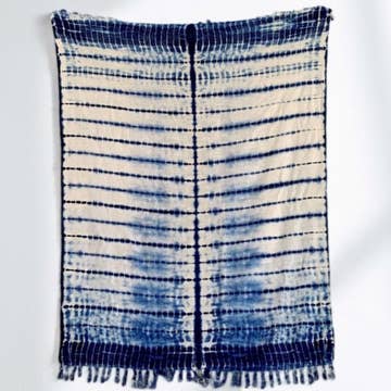 Indigo shibori throws are perfect for the beach, a picnic, or for a cozy night on the couch. This Japanese technique dates back to the 8th century. Traditionally, a white cloth was folded, bunched, or twisted, then tied, and finally dipped into an indigo dye to create a one of a kind organic pattern. Small irregularities or variations in the color should not be considered a defect, this is specific and part of the charm of an entirely handmade product. Each throw is similar in pattern but truly one of a kind. details: 48"x 67" 100% cotton hand dyed made in India wash care: Wash separately for the first few washes. Machine or hand wash in cold water with gentle soap. Rinse under running water until any color bleeding stops. Hang in indirect sunlight. Iron on cotton setting. note: Indigo dyes may crock or rub off on furnishings. Keep with like colors until no color is released during washing. style number: 1000188