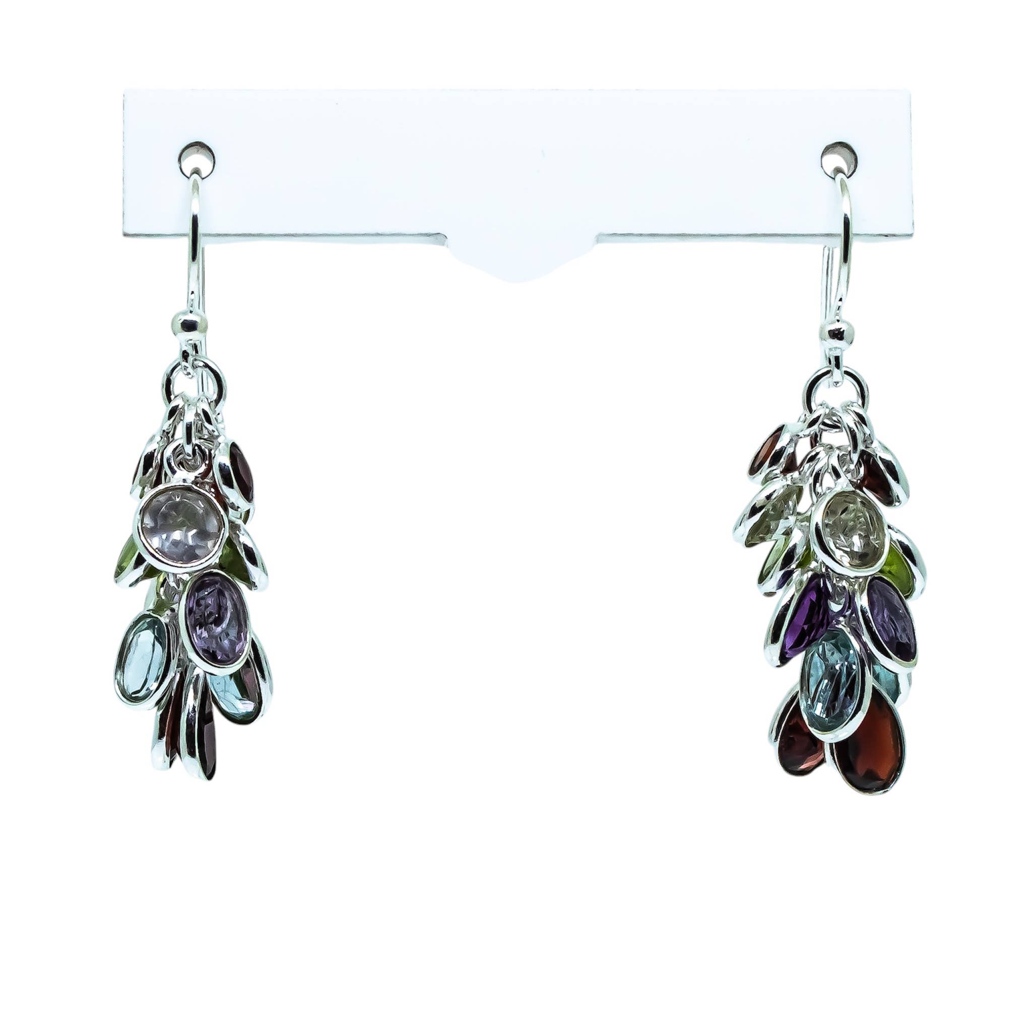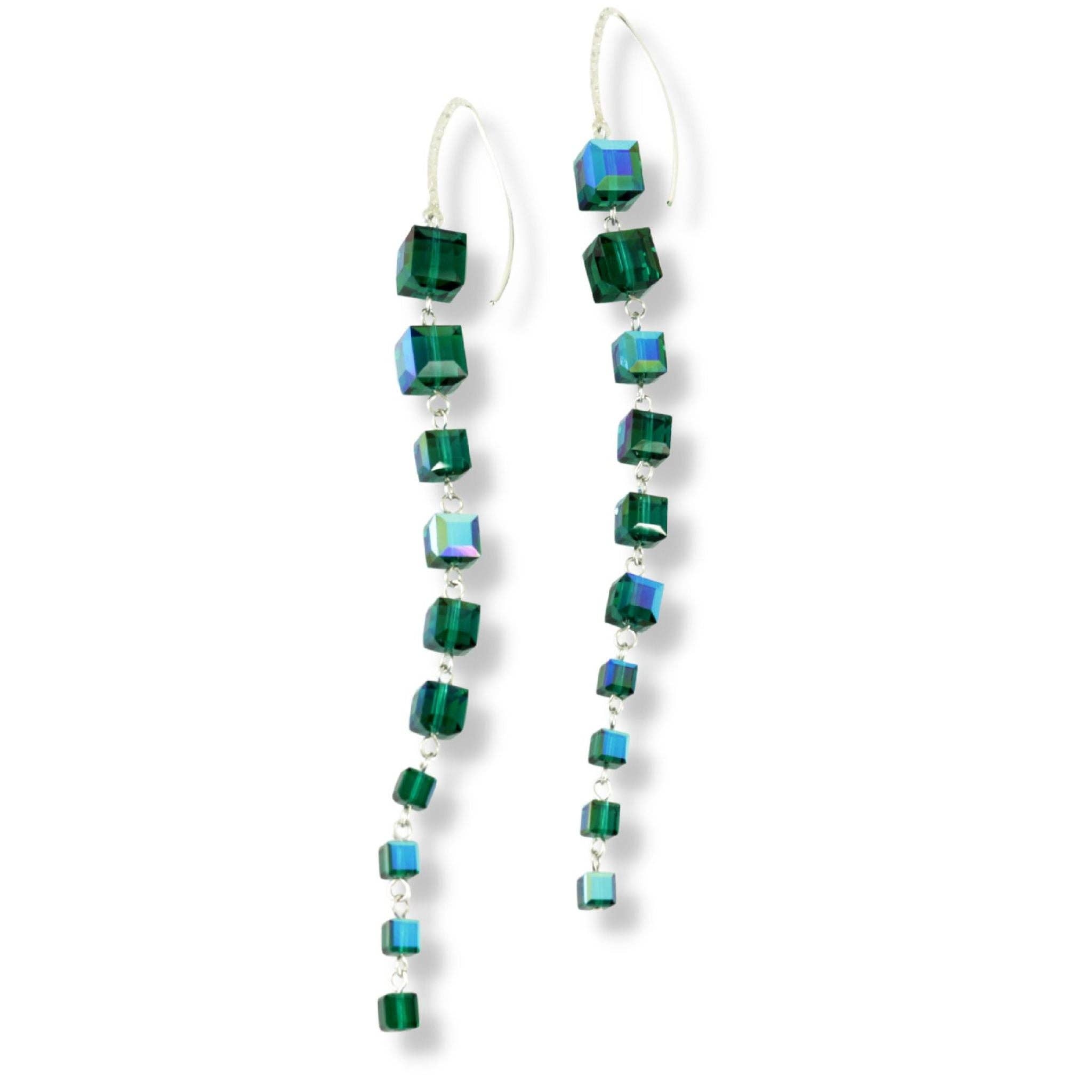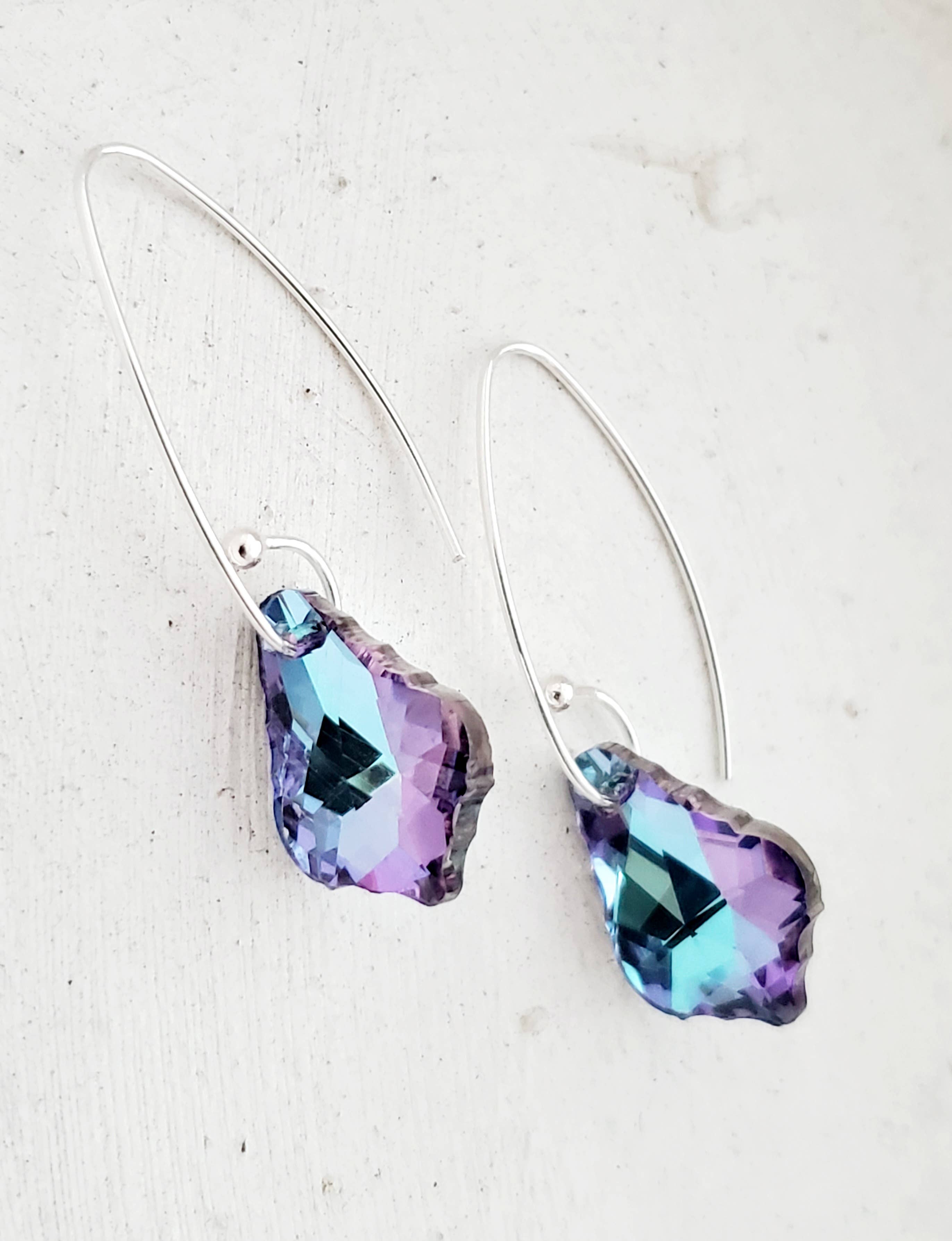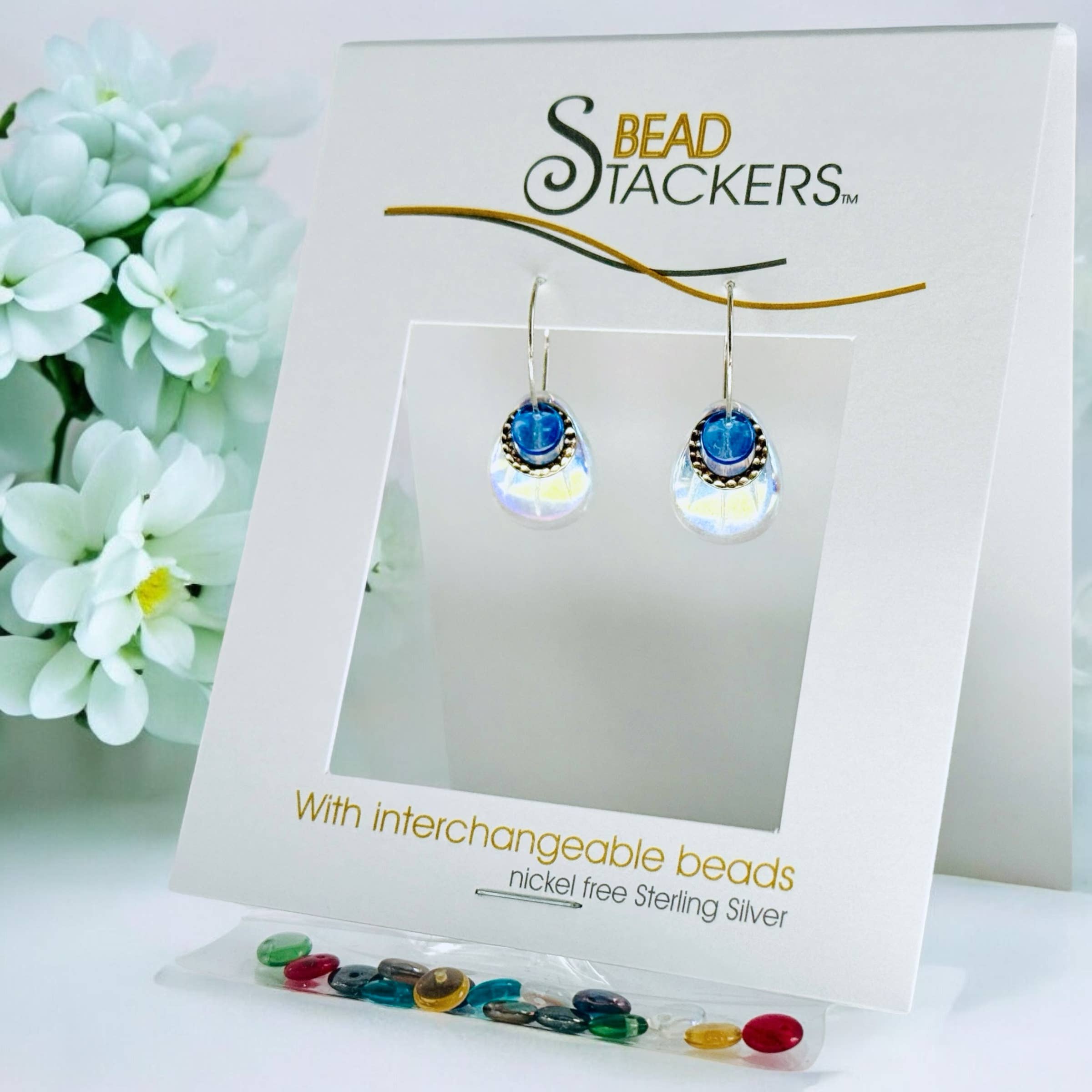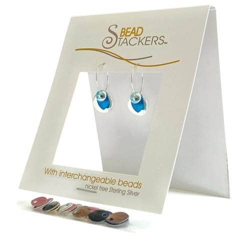 Earrings come with 9 interchangeable colours. Beads are European made glass. Remove the stainless steel leaf and a second look is created. No need for rubber backs. Pin like closure keeps earrings secure on ears. Wires are designed using North American made nickel-free Sterling Silver. 9 colours, 1 1/2” Length.